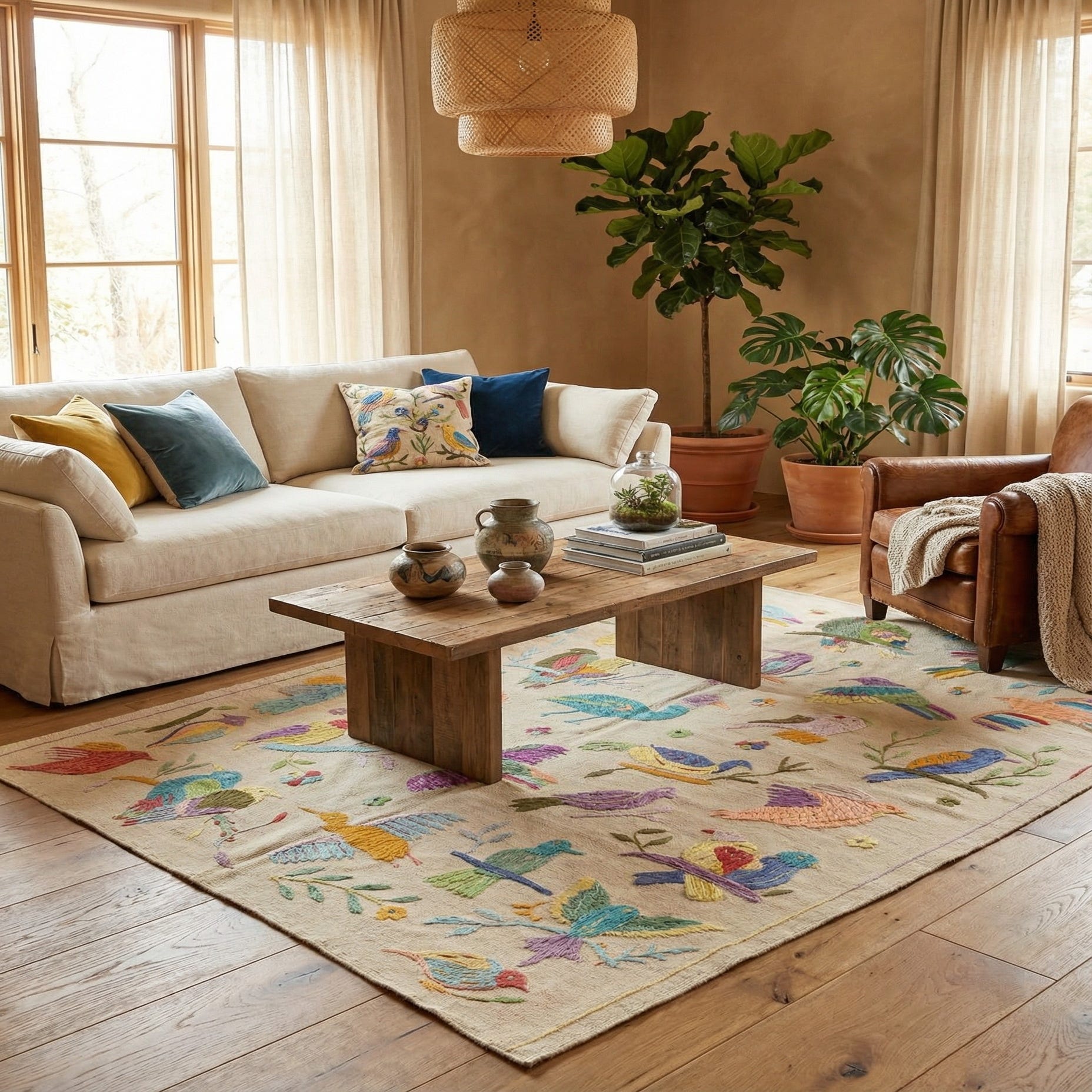 Primary color is Cream. Colors in this rug include: Cream, Blue, Brown, Red, Yellow, Violet, Gold, Green.