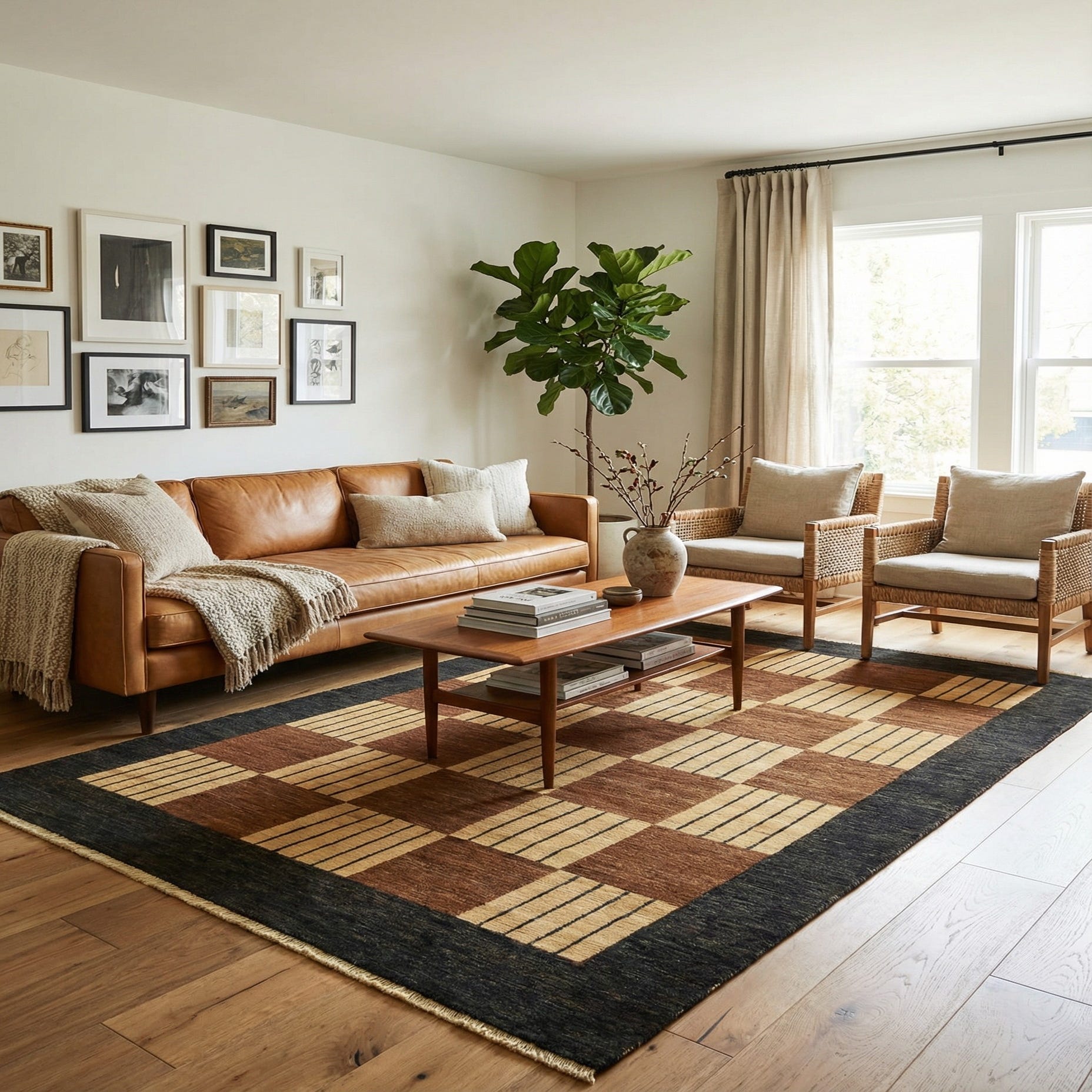 Primary color is Cream. Colors in this rug include: Cream, Brown, Black.
