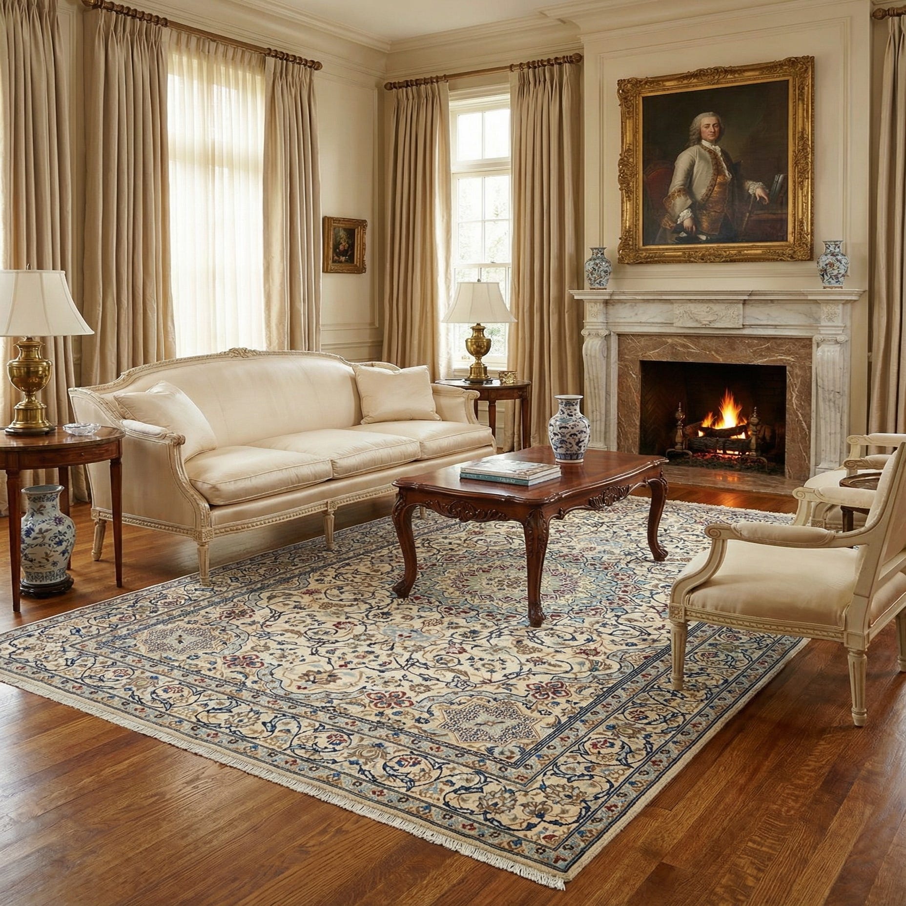 Primary color is Cream. Colors in this rug include: Cream, Cream, Light Brown, Green, Blue, Dark Blue, Brown, Red.