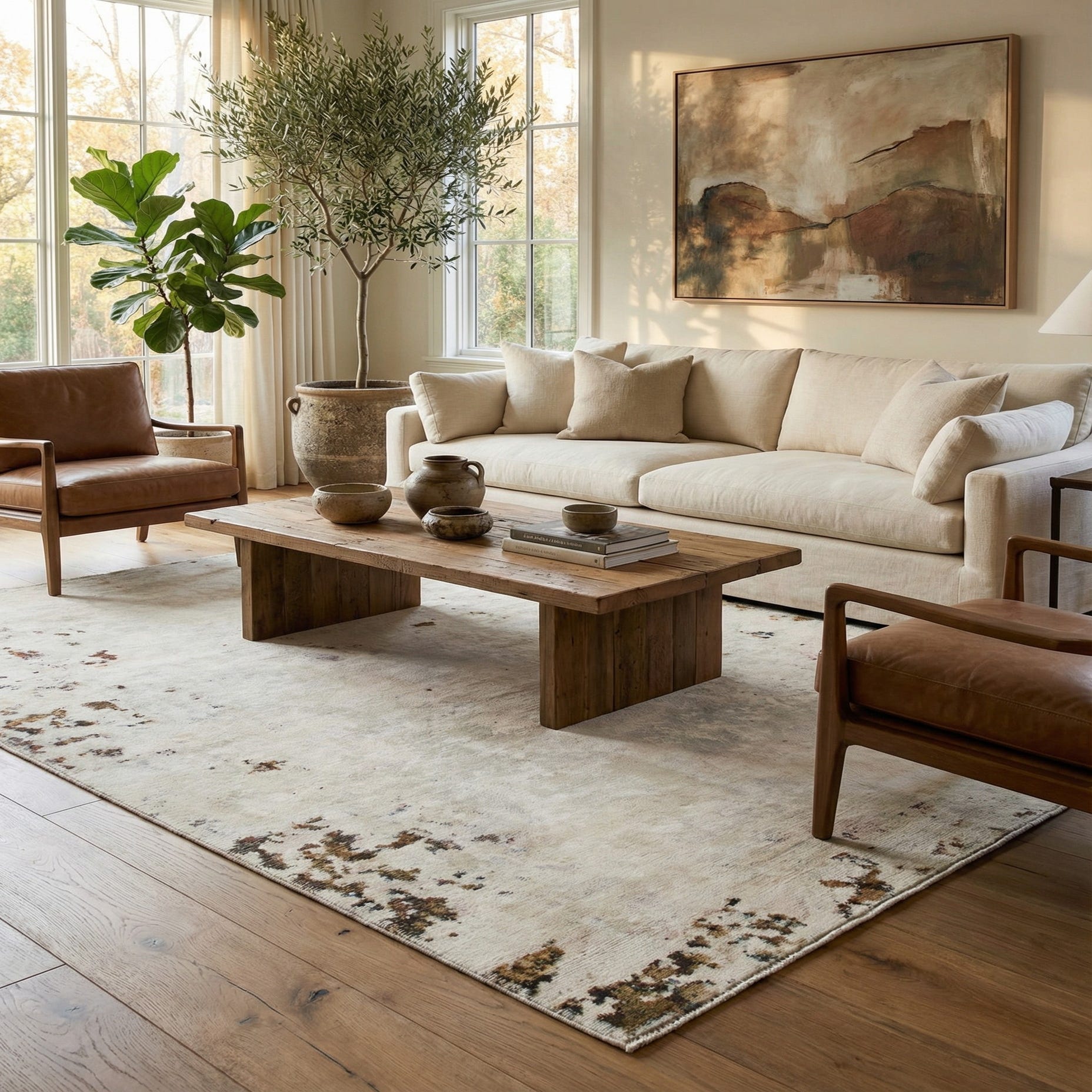 Primary color is Cream. Colors in this rug include: Cream, Brown, Light Brown, Navy Blue, Olive.