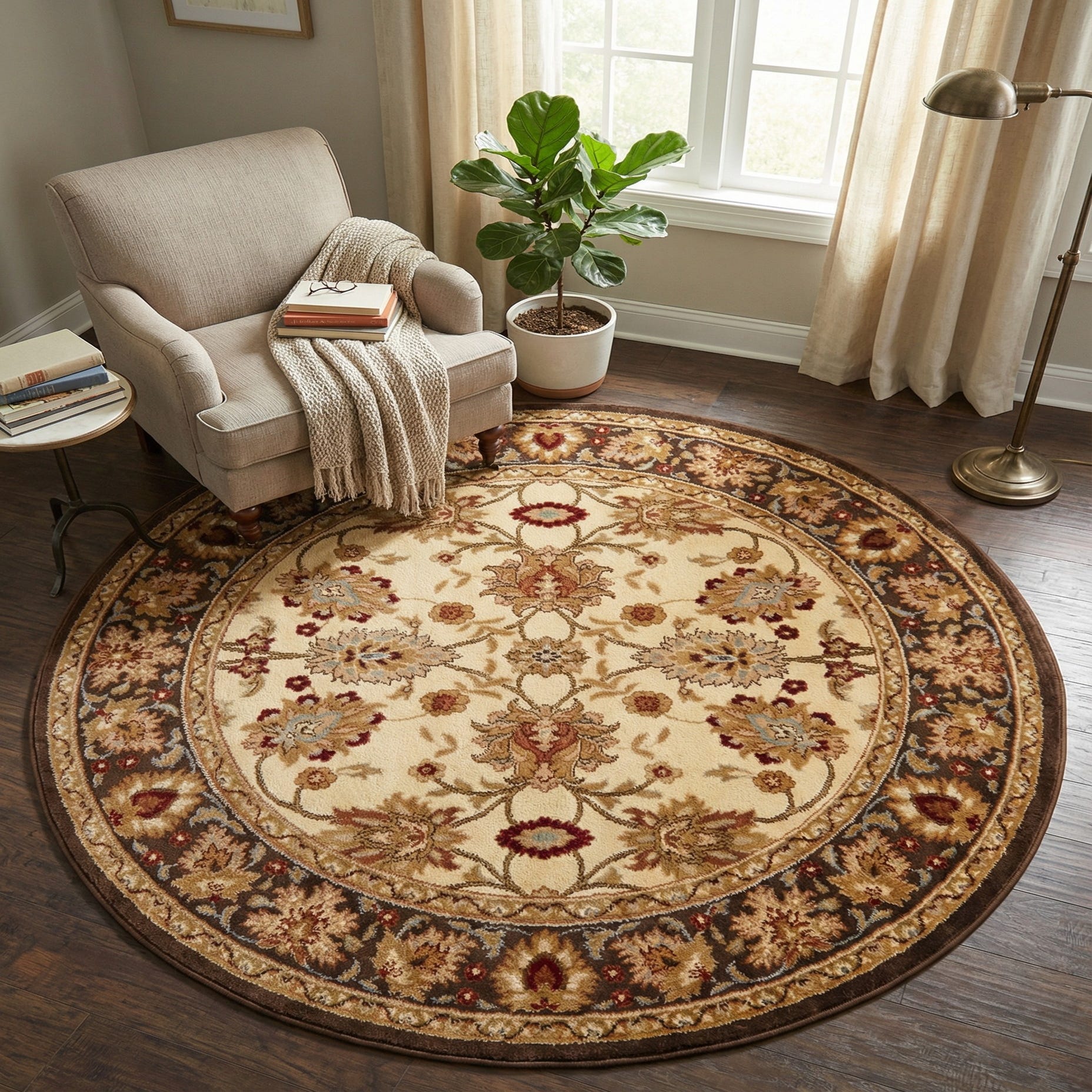 Primary color is Cream. Colors in this rug include: Cream, Brown, Light Blue, Light Green, Red, Tan.