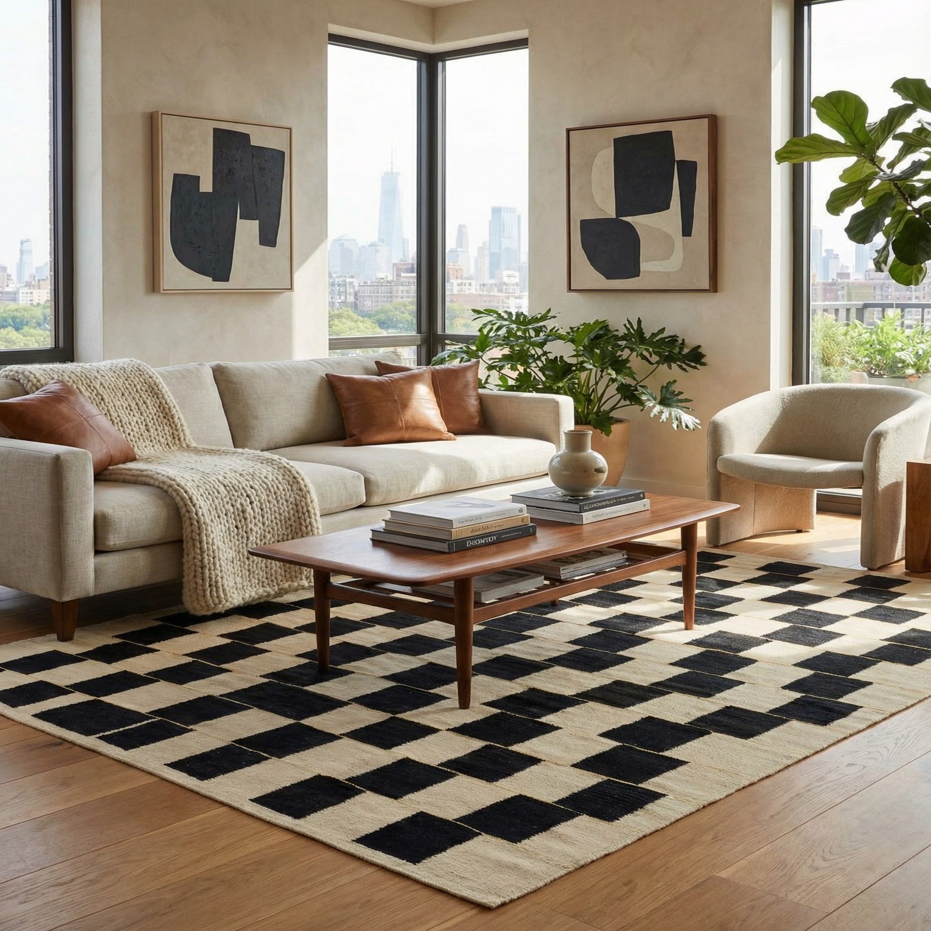 Primary color is Cream. Colors in this rug include: Cream, Black.