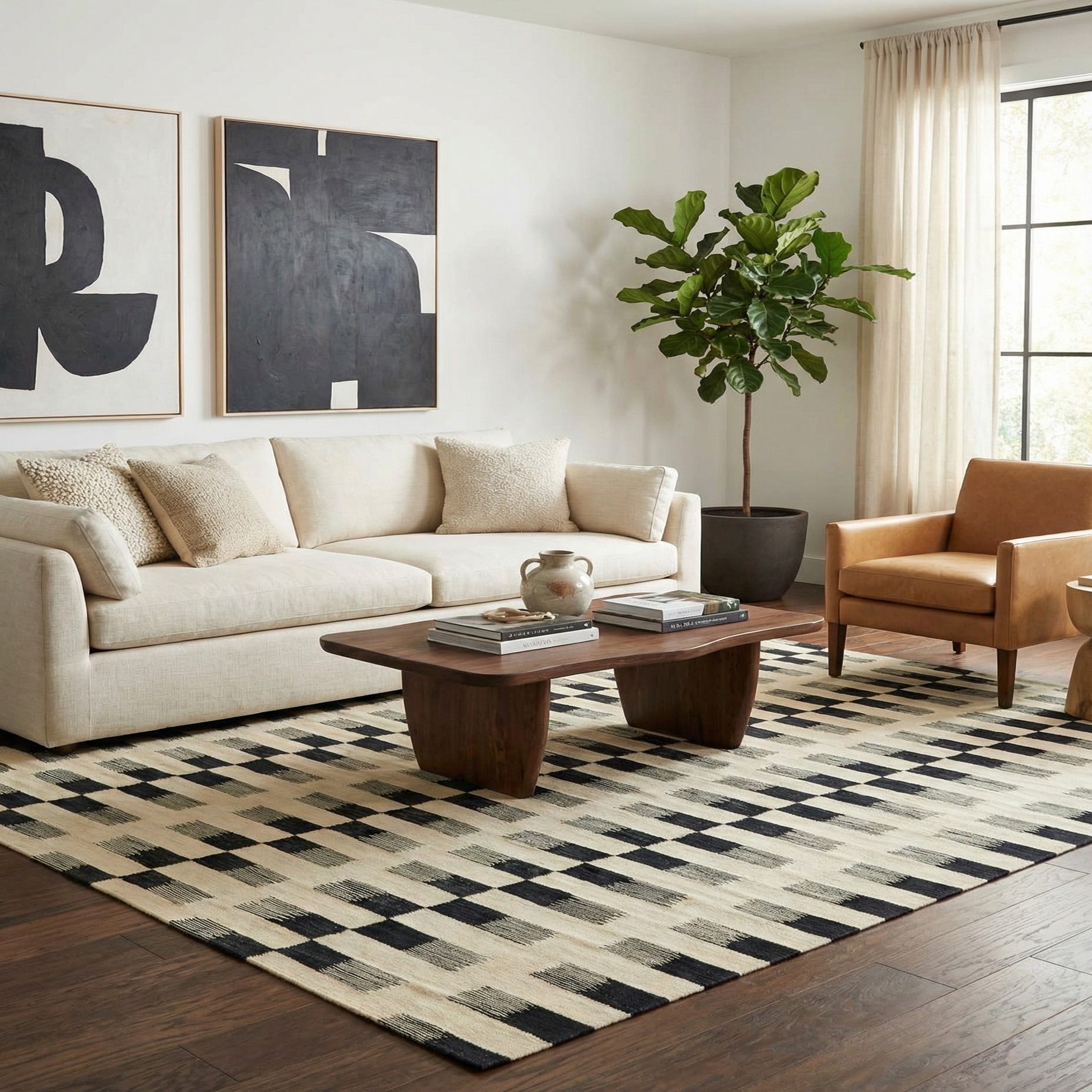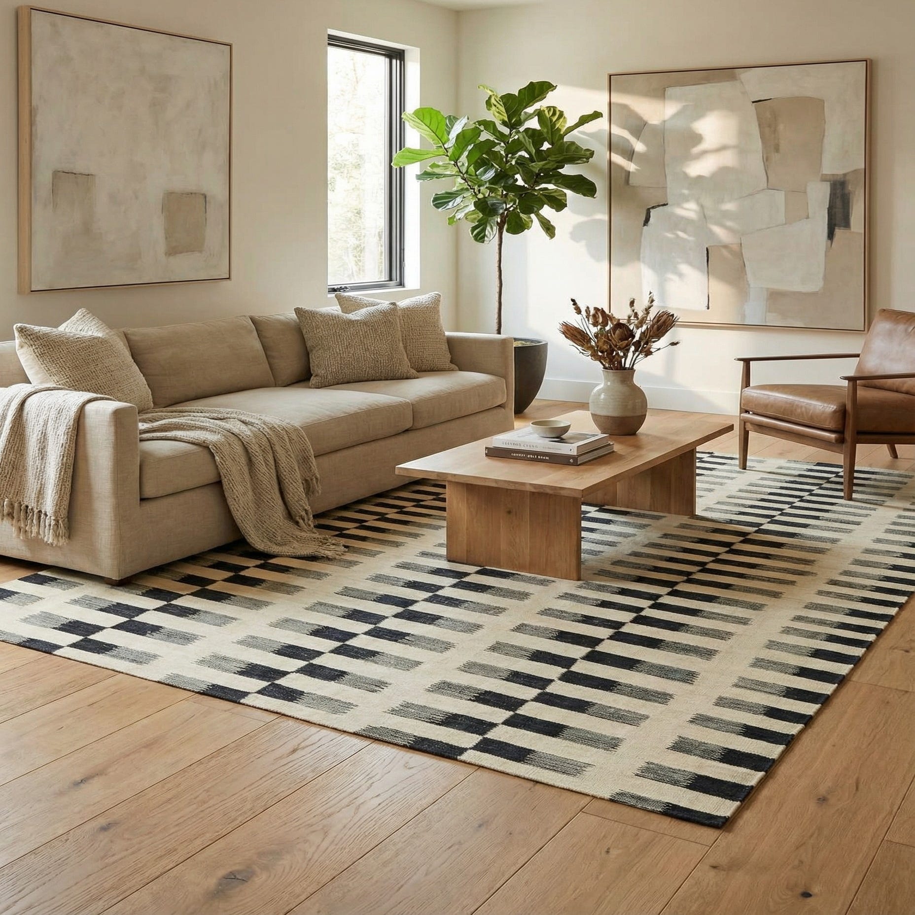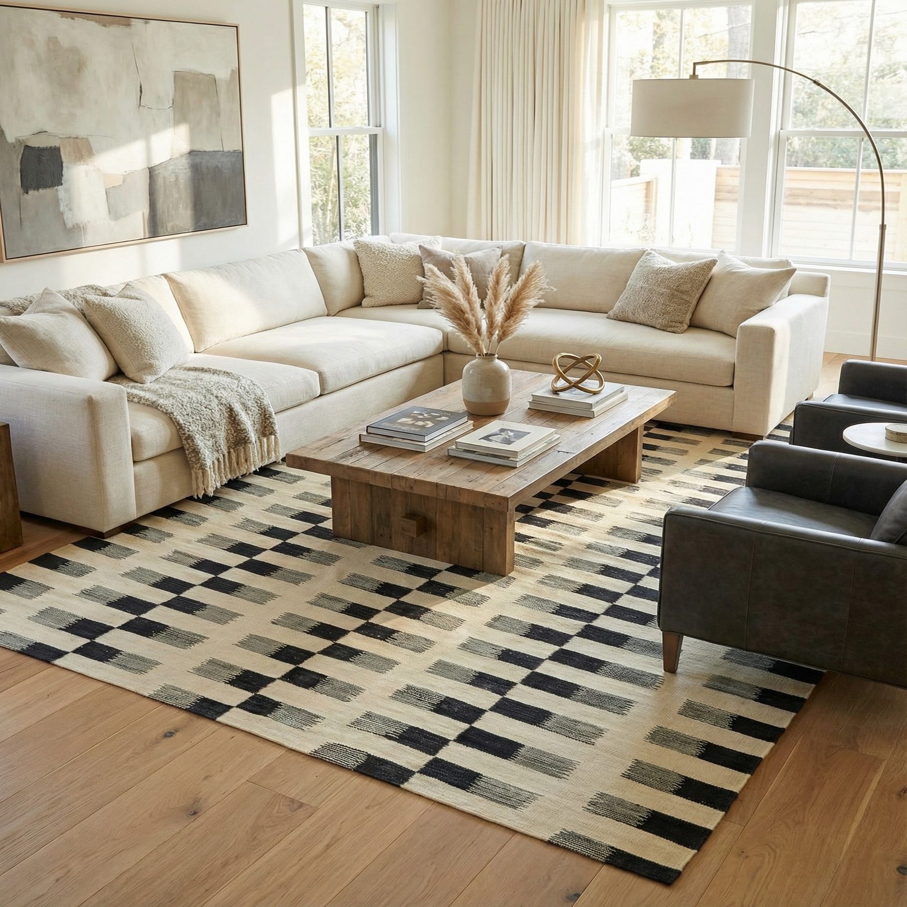 Primary color is Cream. Colors in this rug include: Cream, Black.