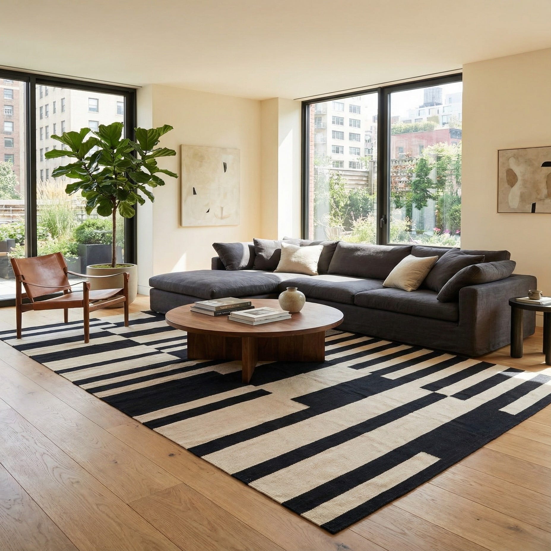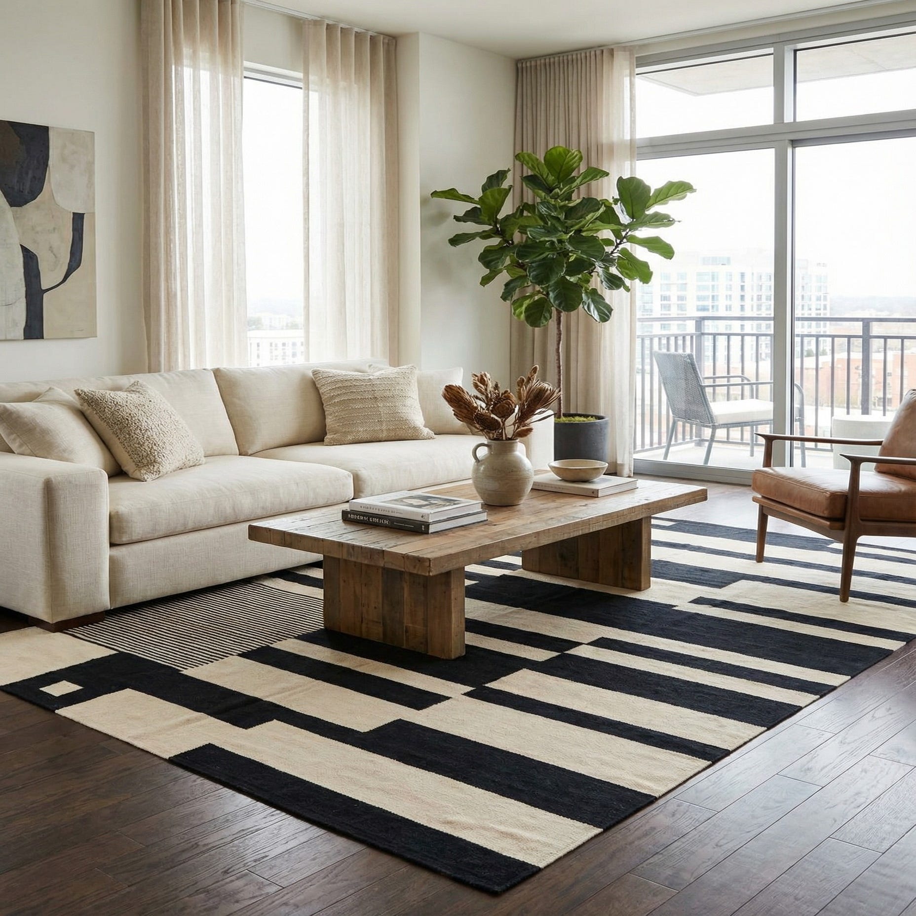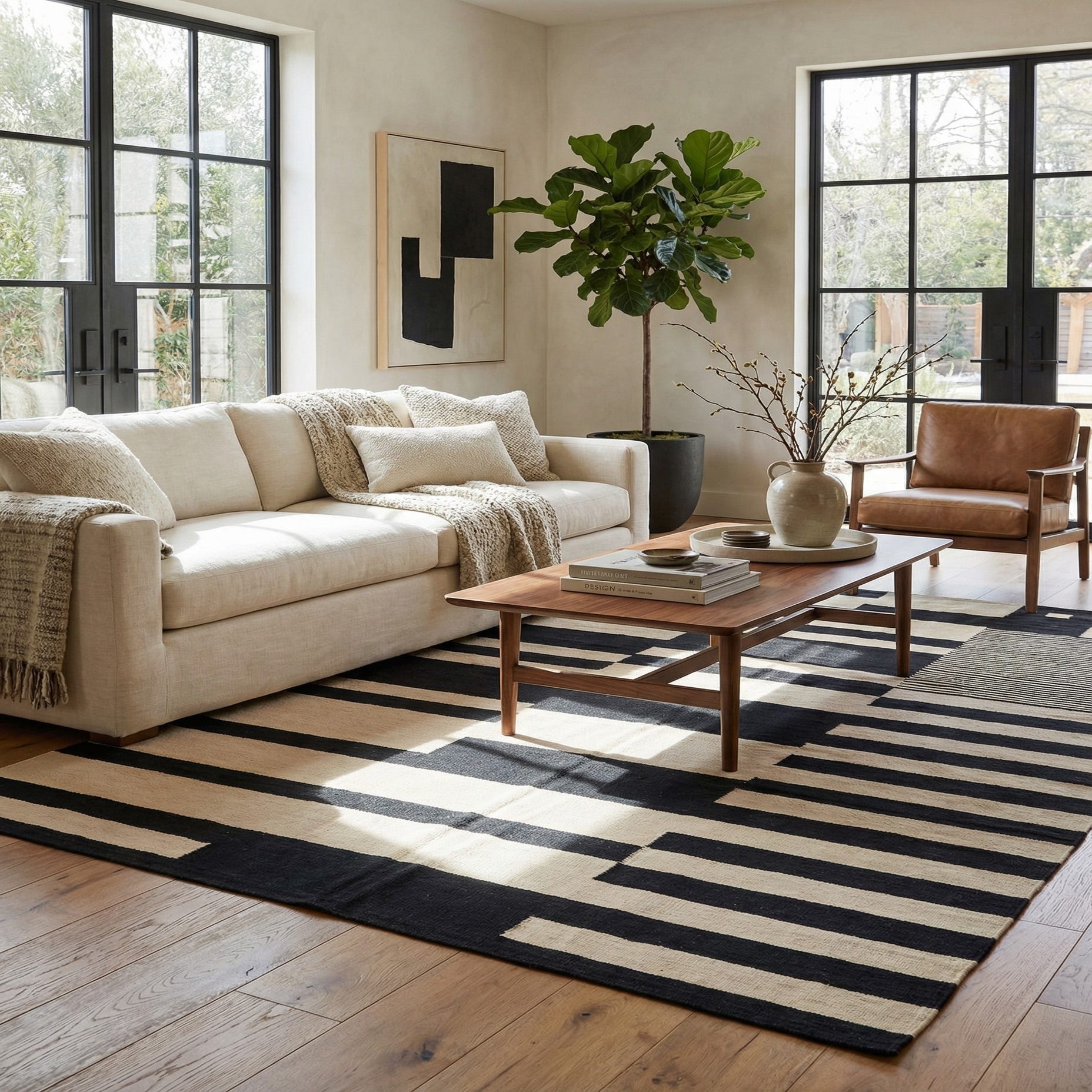 Primary color is Cream. Colors in this rug include: Cream, Black.