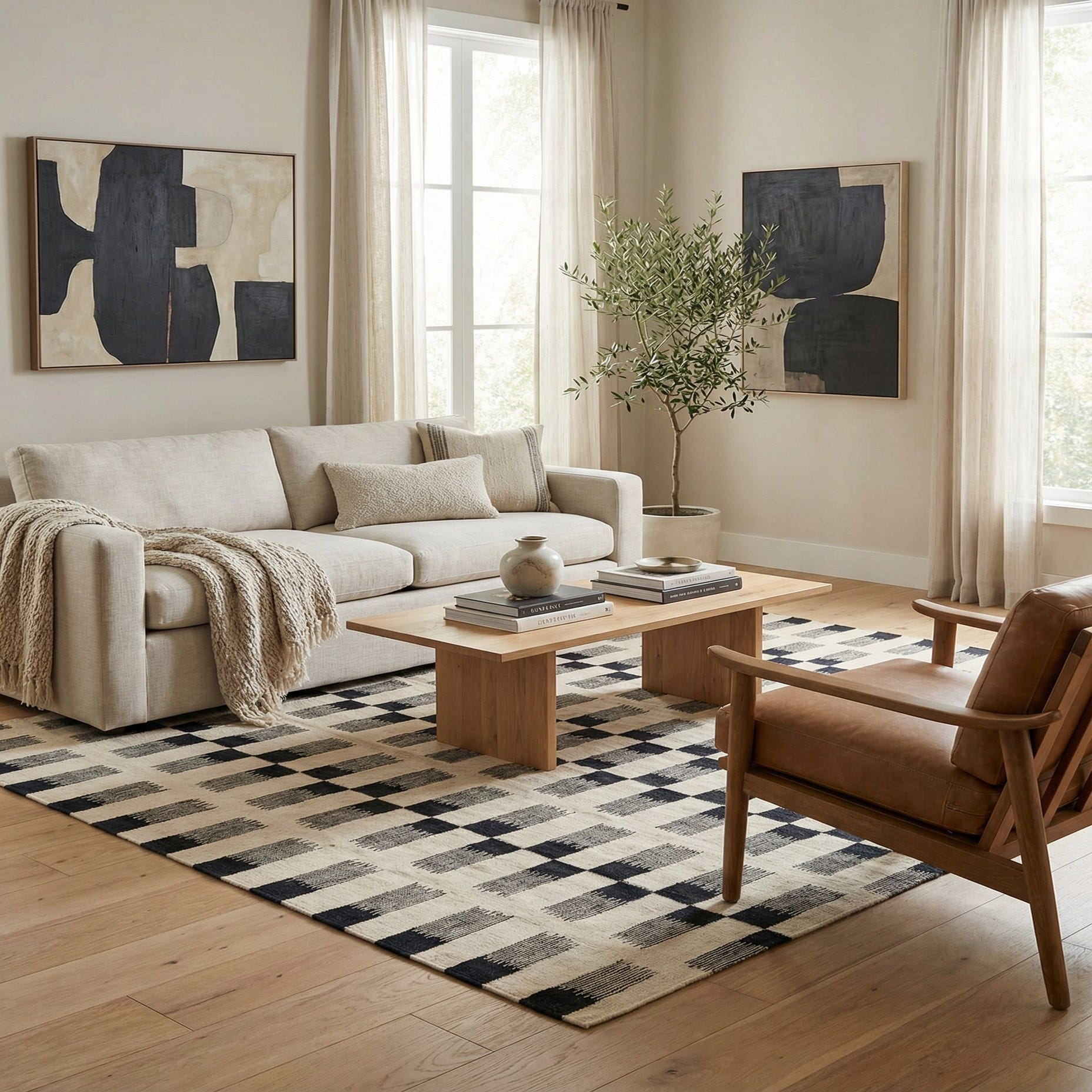 Primary color is Cream. Colors in this rug include: Cream, Black.
