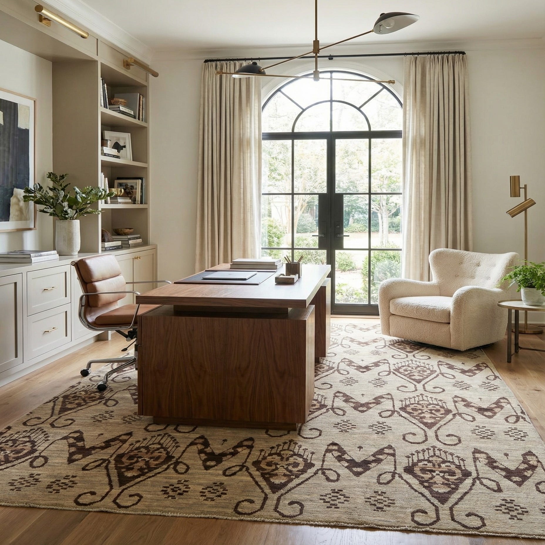 Primary color is Cream. Colors in this rug include: Cream, Brown, Beige.