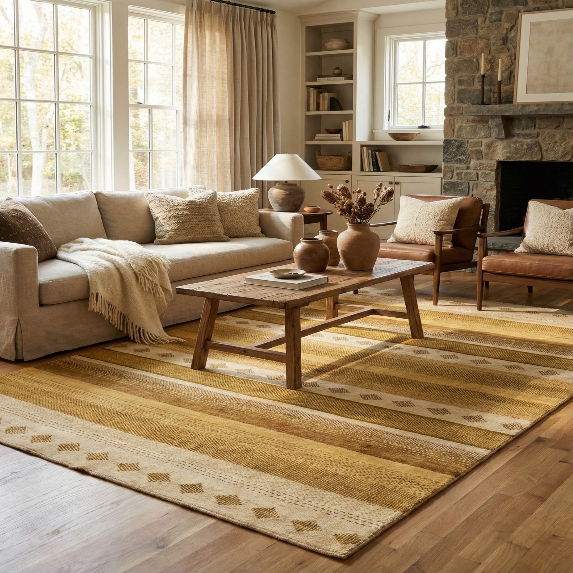Primary color is Cream. Colors in this rug include: Cream, Olive, Tan.