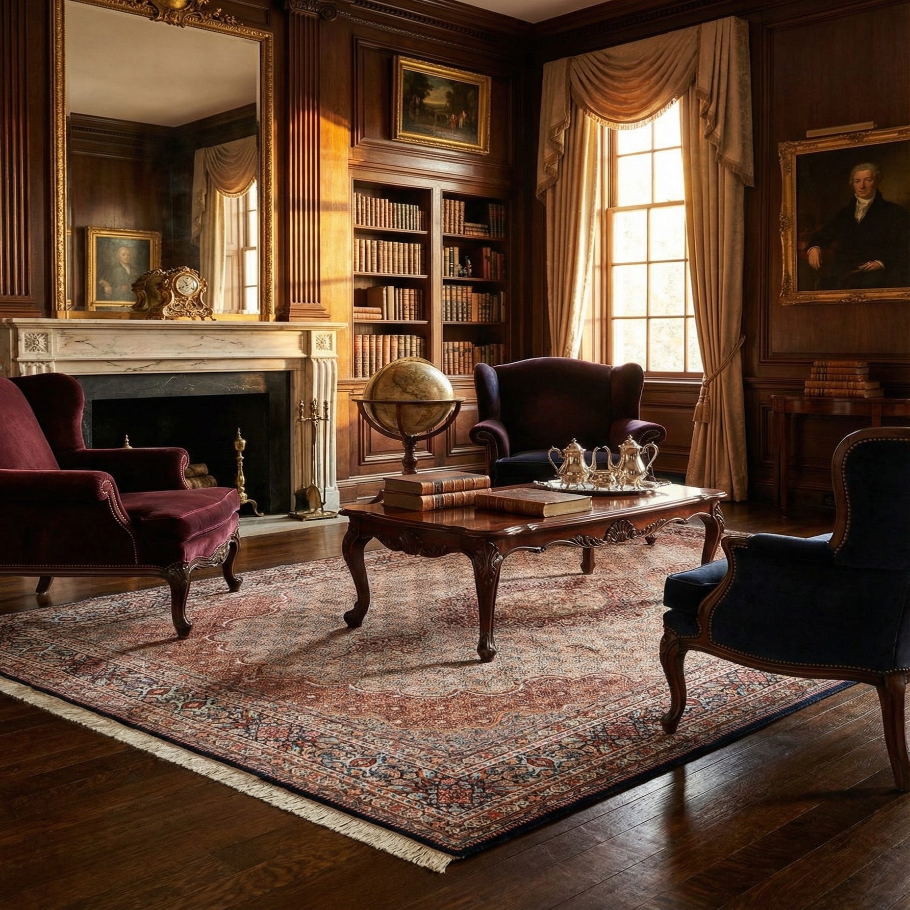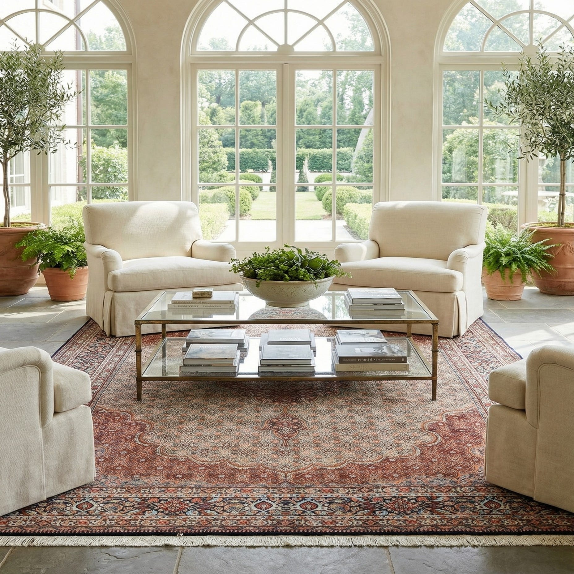 Primary color is Cream. Colors in this rug include: Cream, Cream, Orange, Dark Blue, Light Blue, Brown.