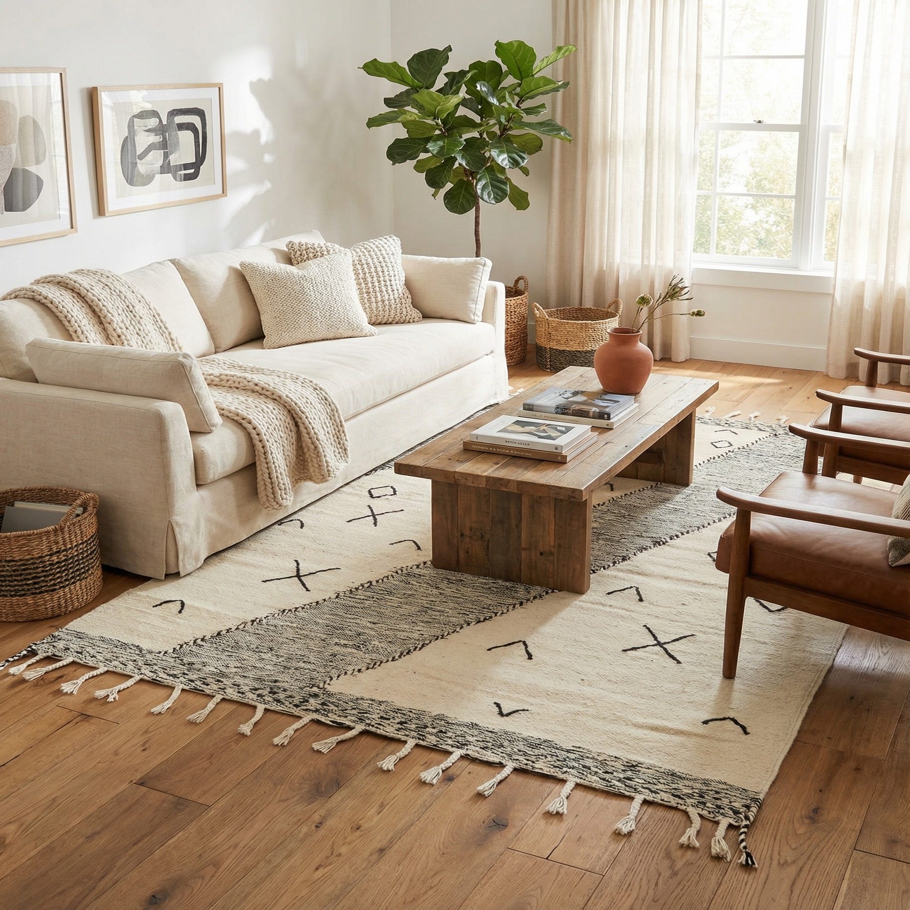 Primary color is Cream. Colors in this rug include: Cream, Black.