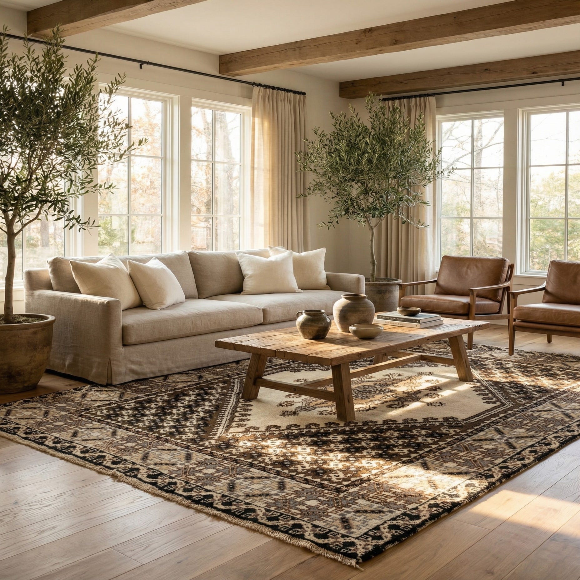 Primary color is Cream. Colors in this rug include: Cream, Brown, Black, Beige.