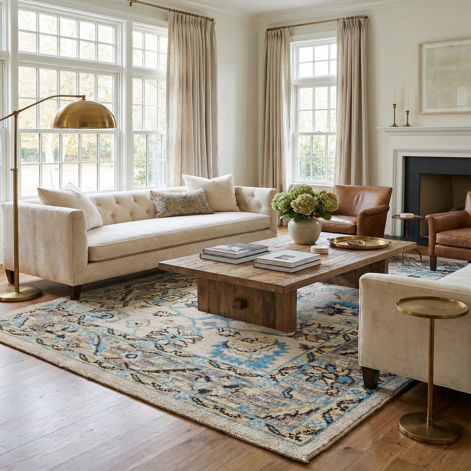 Primary color is Cream. Colors in this rug include: Cream, Brown, Yellow, Light Blue.