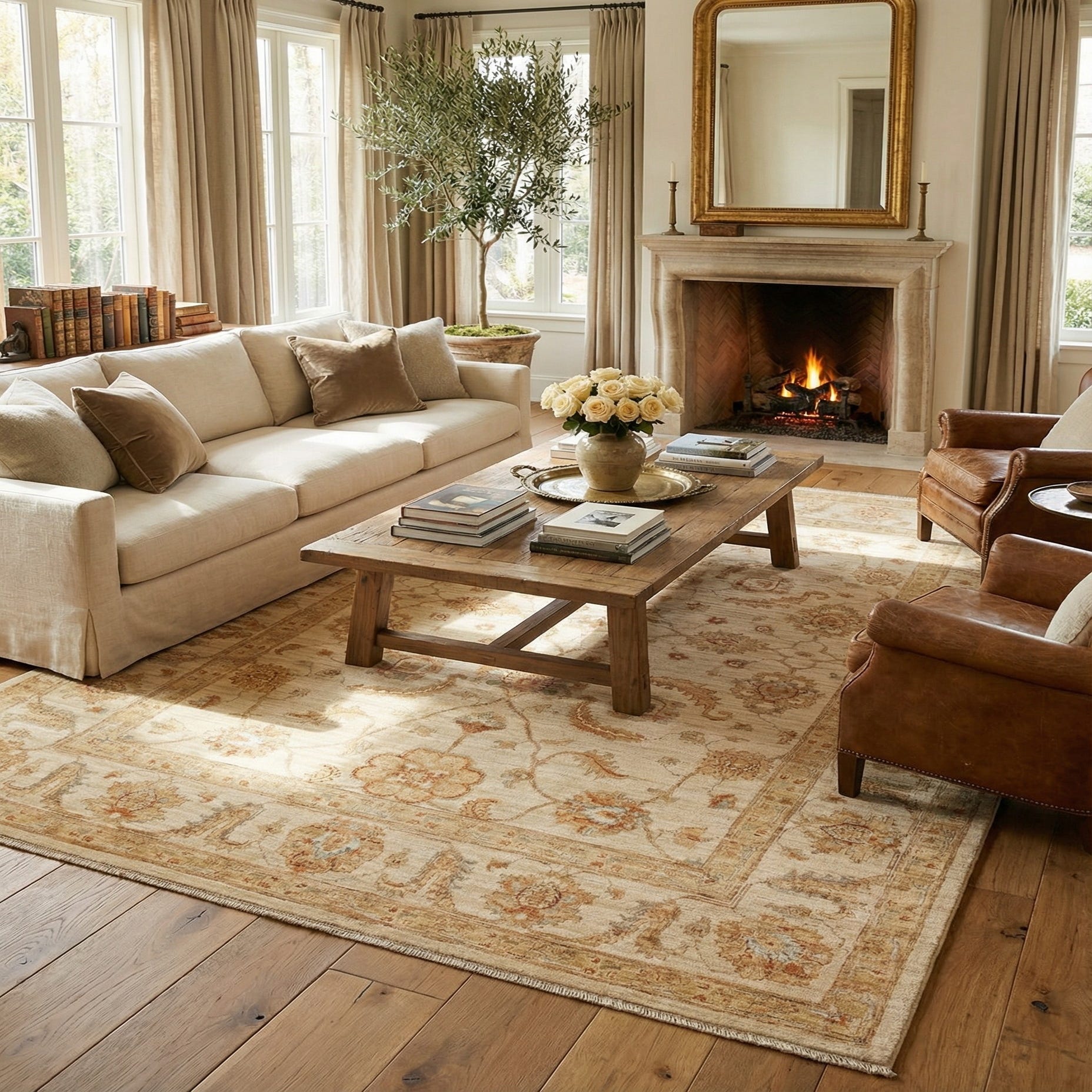 Primary color is Cream. Colors in this rug include: Cream, Beige, Green, Peach, Tan, Terracotta, Olive.