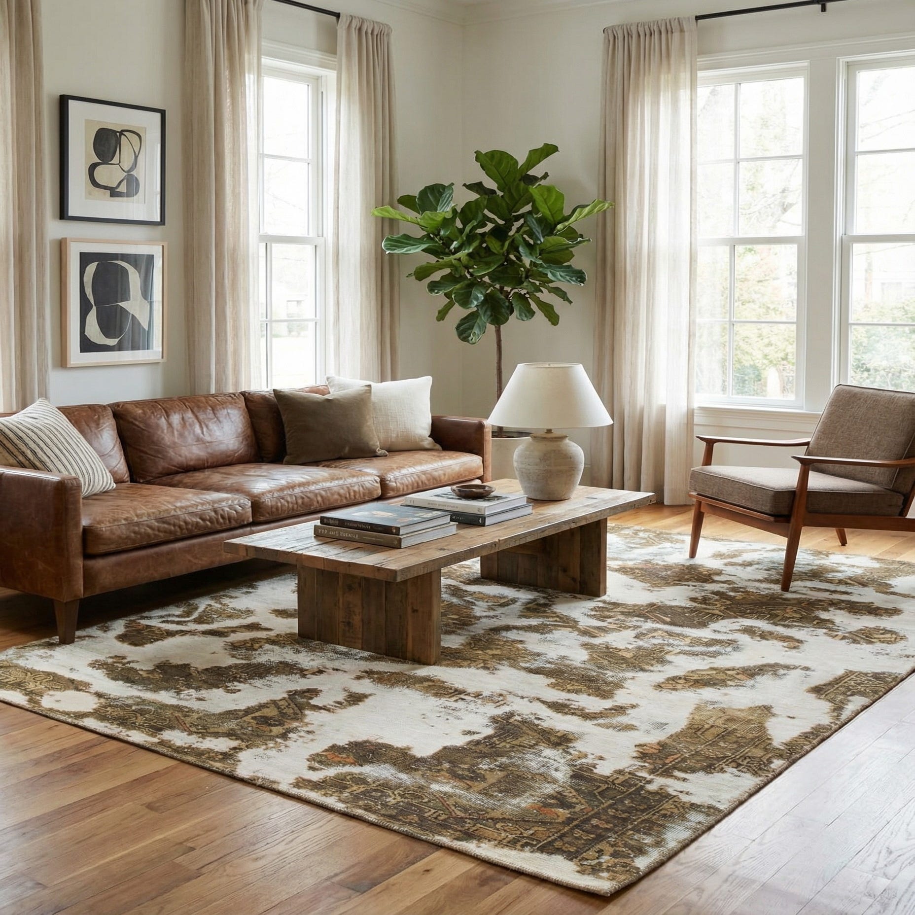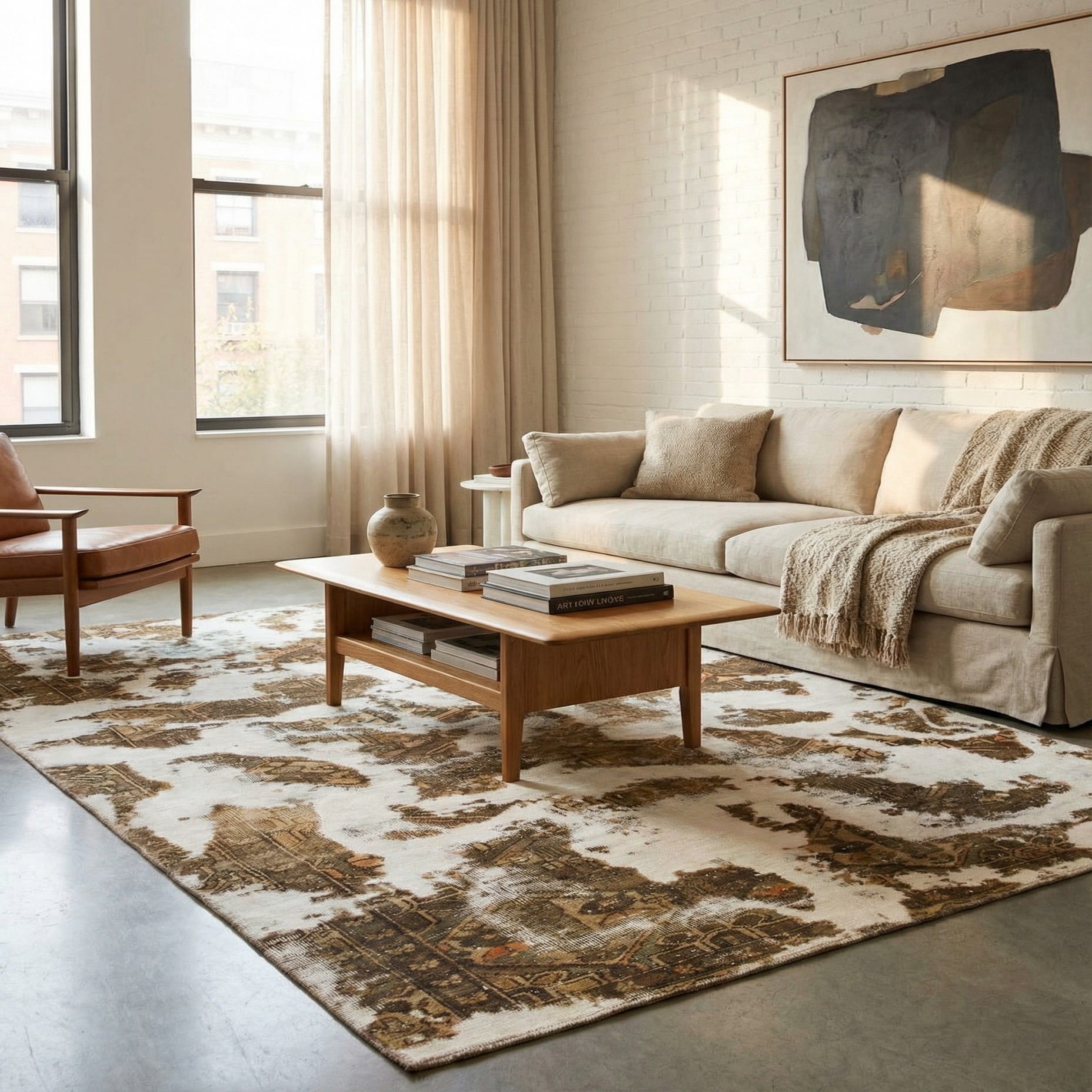 Primary color is Cream. Colors in this rug include: Cream, Brown, Light Brown, Tan, Olive, Peach.