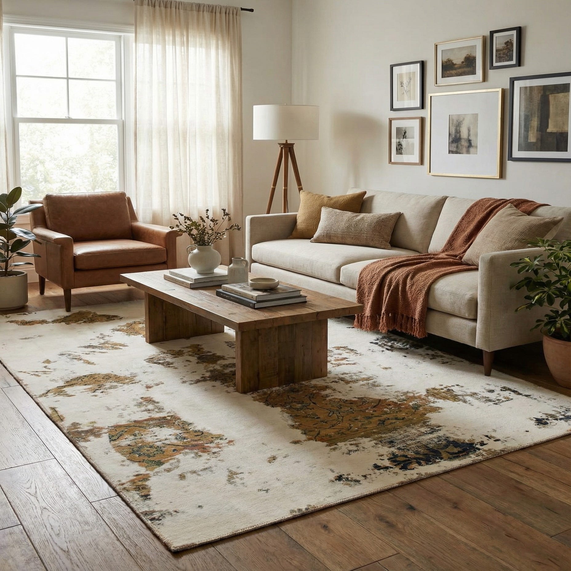 Primary color is Cream. Colors in this rug include: Cream, Brown, Navy Blue, Rust Red, Tan.