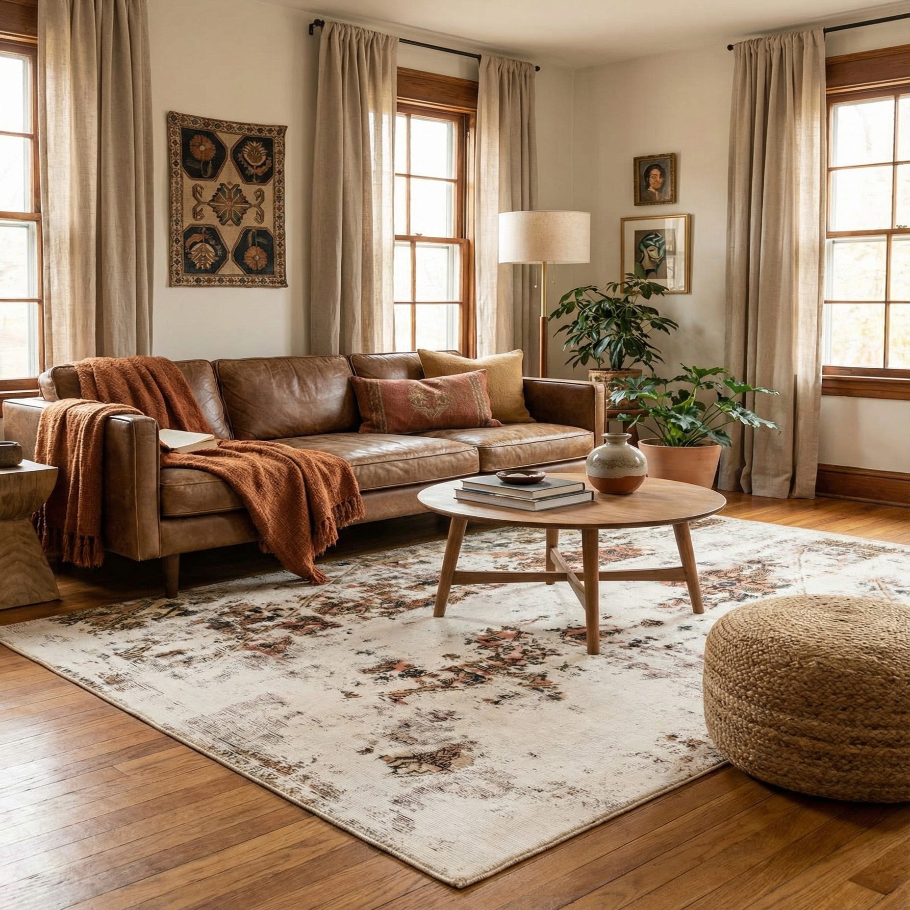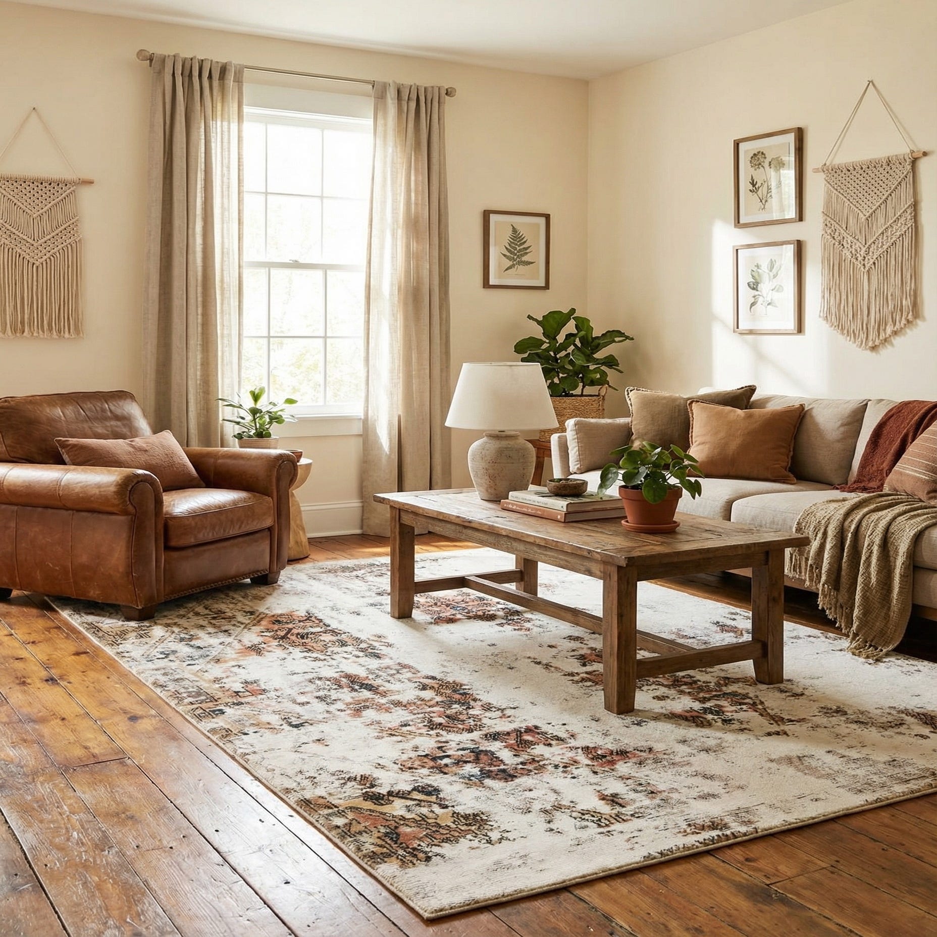 Primary color is Cream. Colors in this rug include: Cream, Brown, Green, Turquoise, Tan.