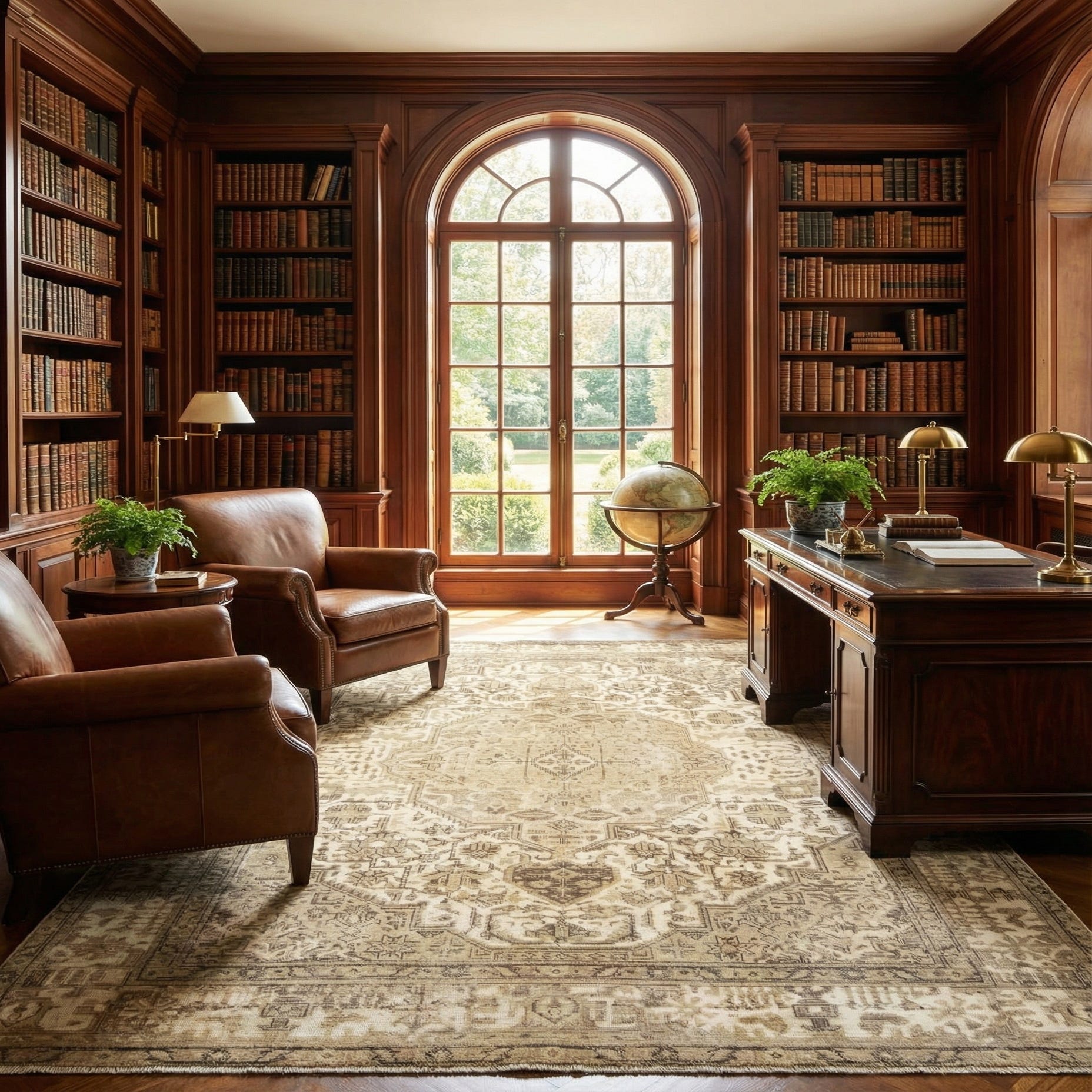 Primary color is Cream. Colors in this rug include: Cream, Beige, Brown, Green.