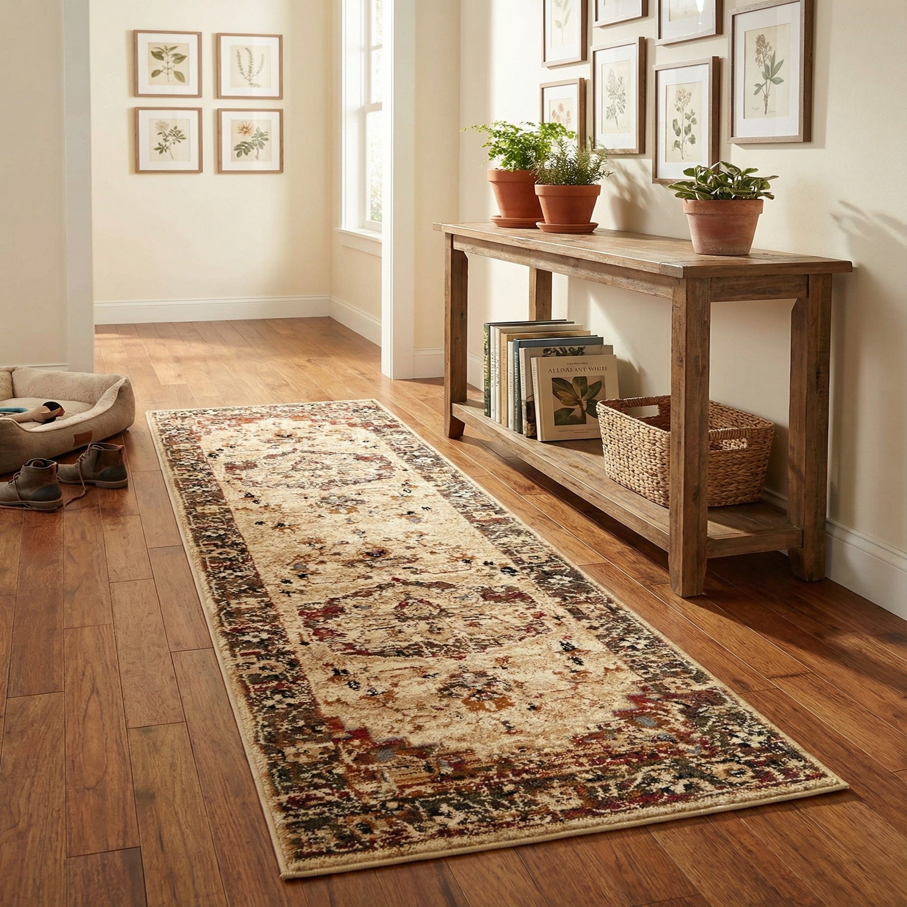 Primary color is Cream. Colors in this rug include: Cream, Beige, Black, Burgundy, Gray, Light Brown.