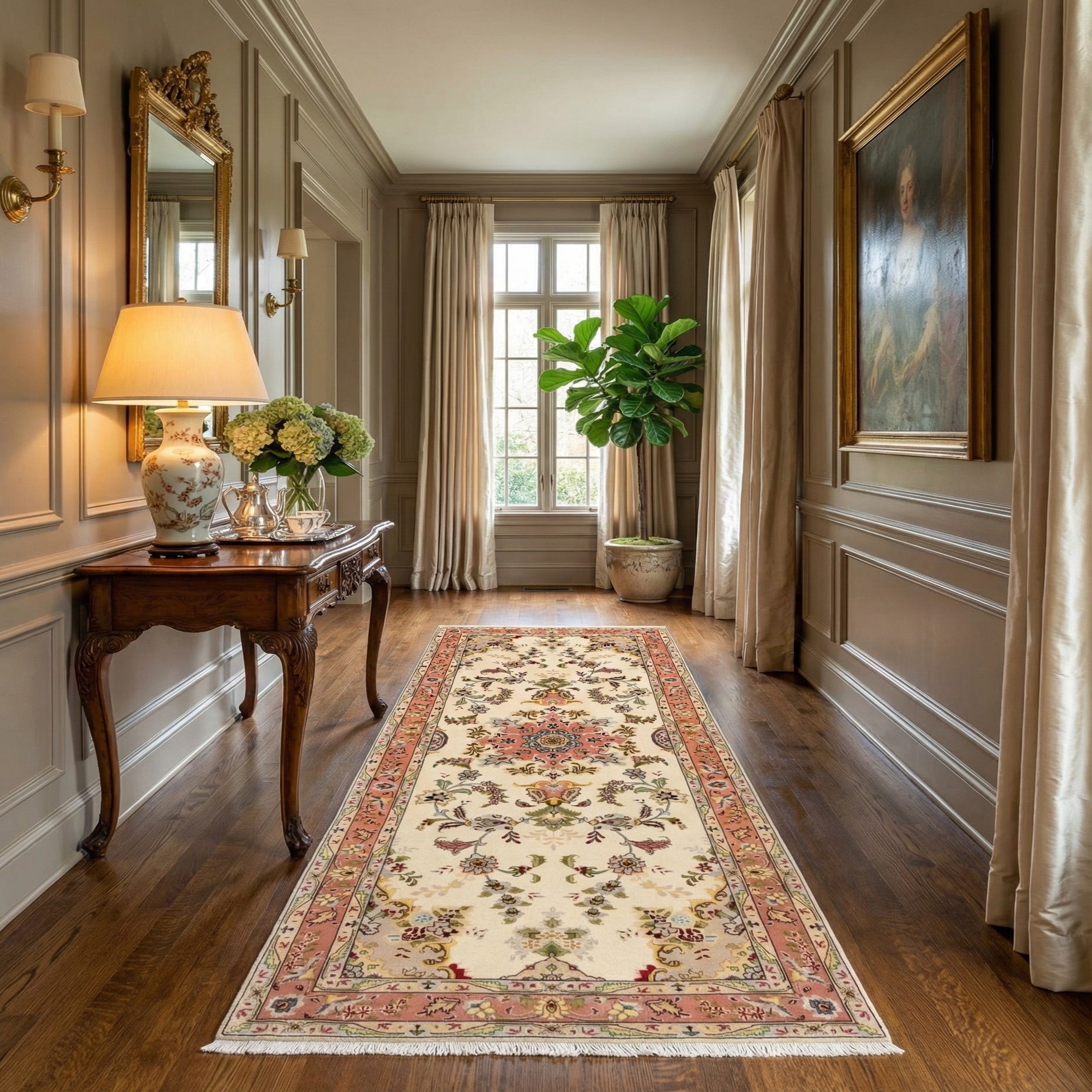 Primary color is Cream. Colors in this rug include: Cream, Cream, Pink, Olive, Brown, Yellow, Blue, Red.