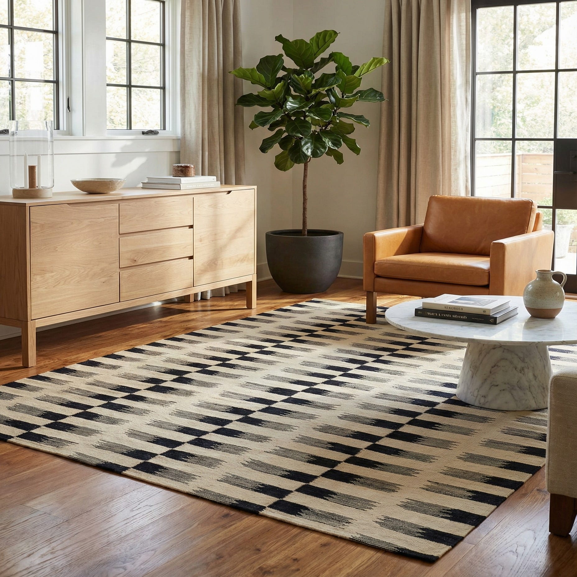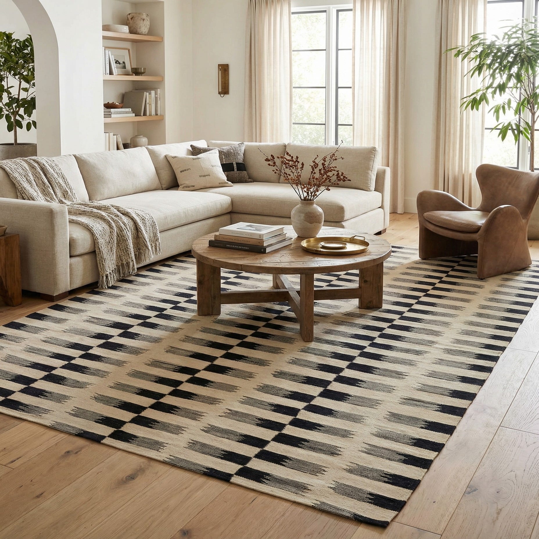 Primary color is Cream. Colors in this rug include: Cream, Black.