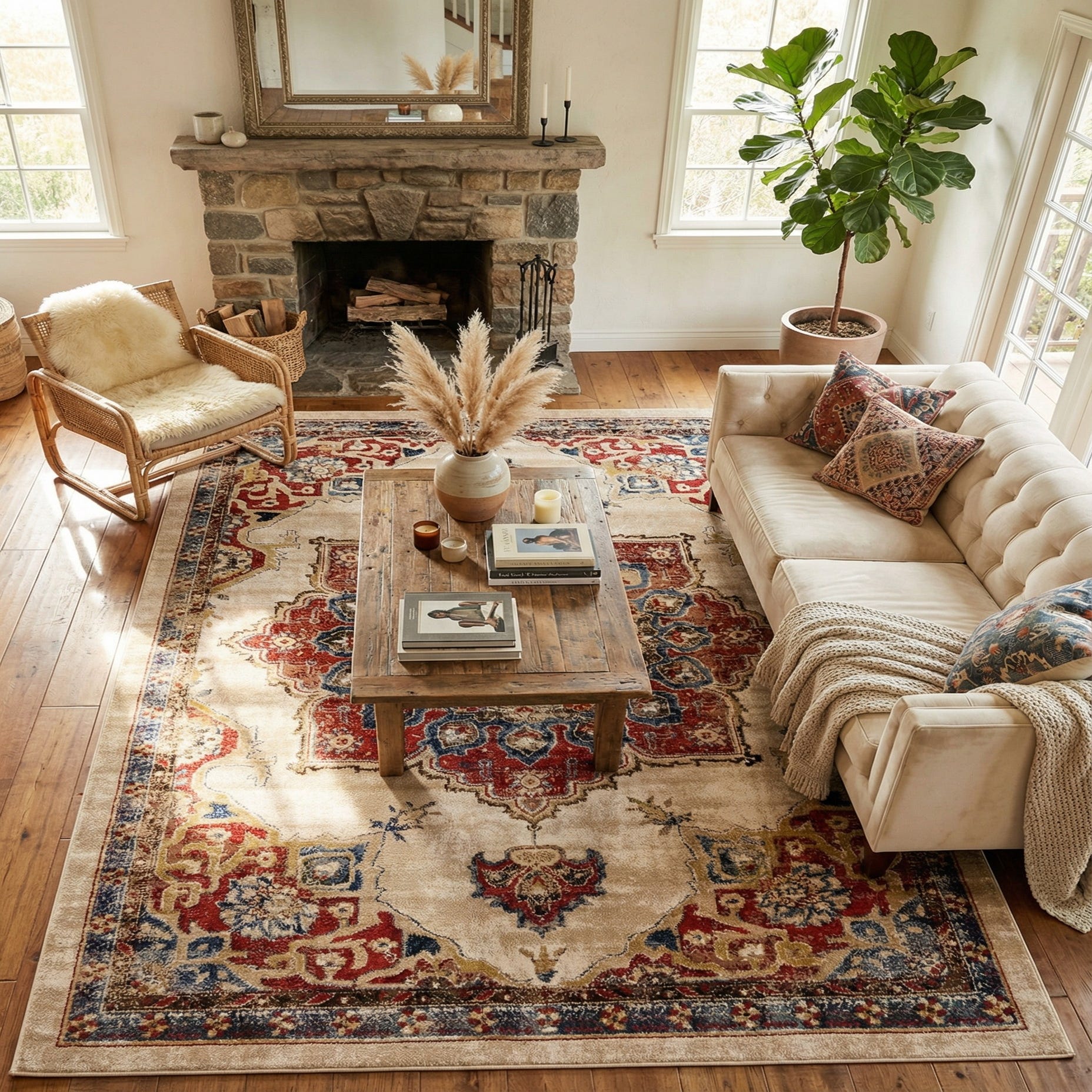 Primary color is Cream. Colors in this rug include: Cream, Blue, Brown, Burgundy, Gold, Light Blue, Olive, Orange, Puce.