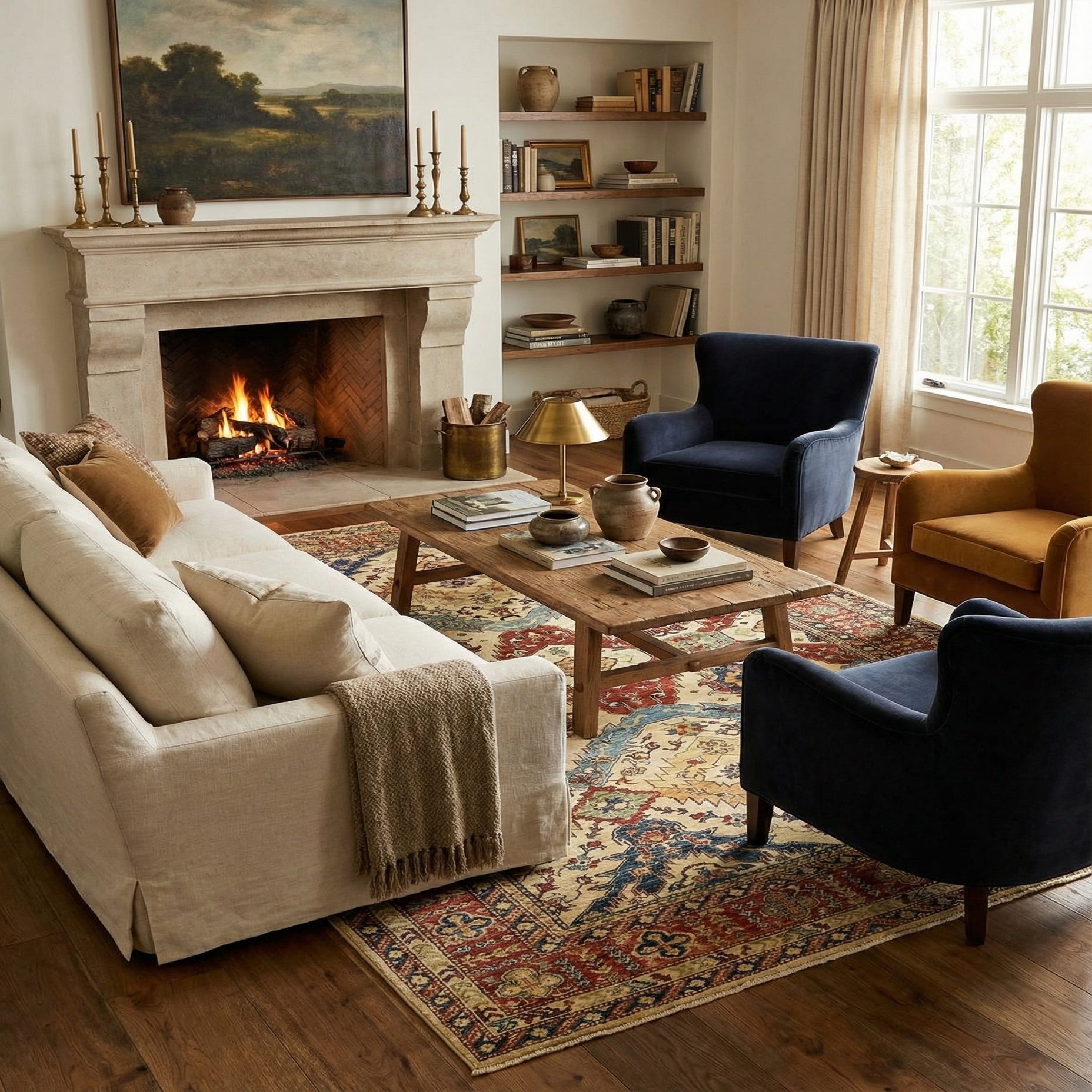 Primary color is Cream. Colors in this rug include: Cream, Black, Blue, Green, Gold, Navy Blue, Red, Orange.