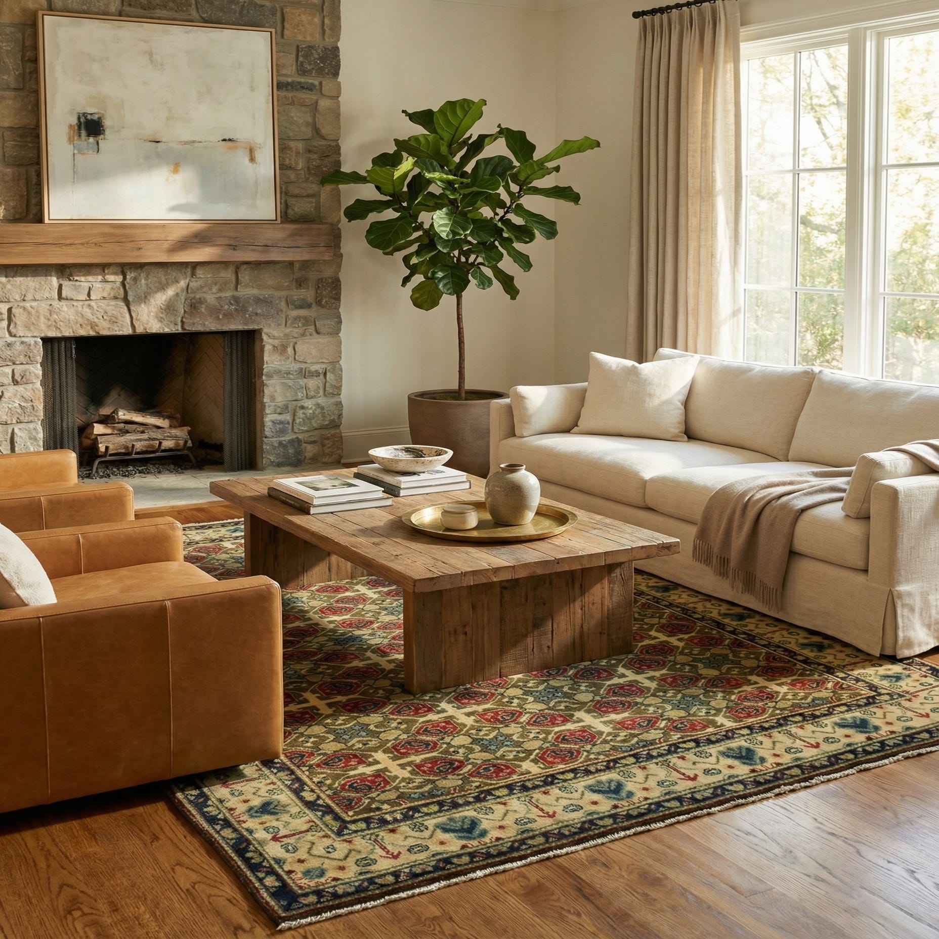 Primary color is Cream. Colors in this rug include: Cream, Beige, Black, Blue, Brown, Navy Blue, Red, Yellow.