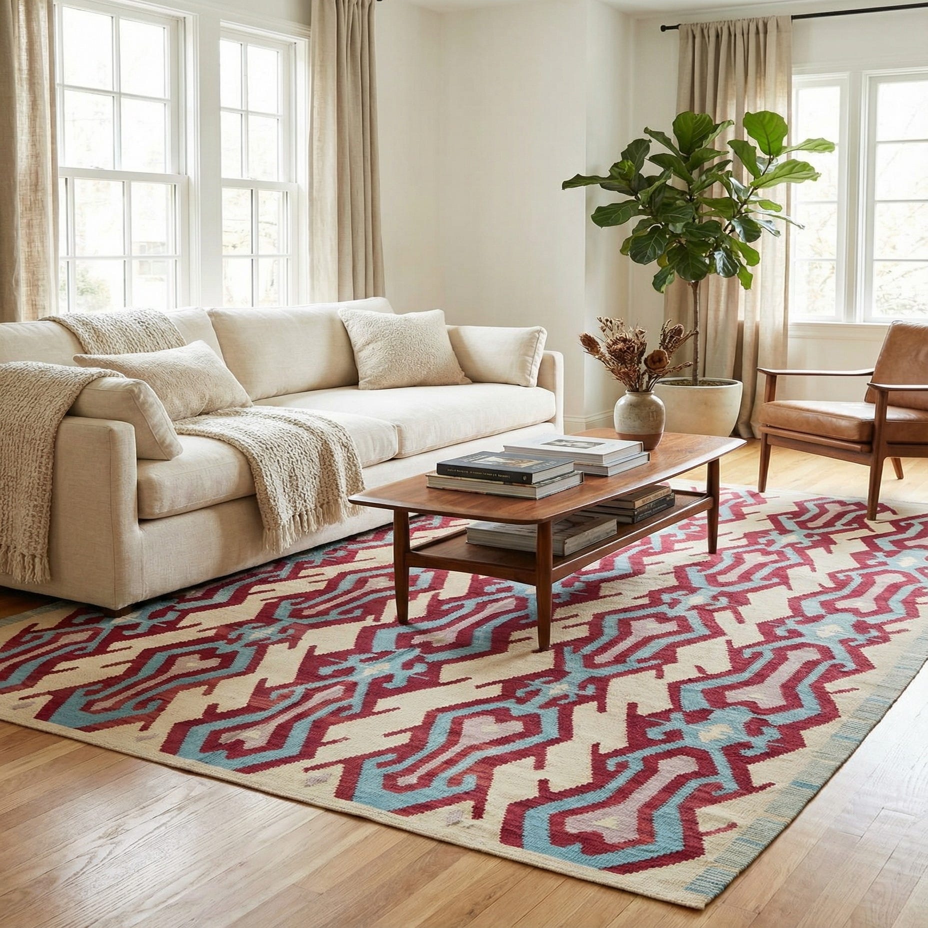 Primary color is Cream. Colors in this rug include: Cream, Red, Light Blue.