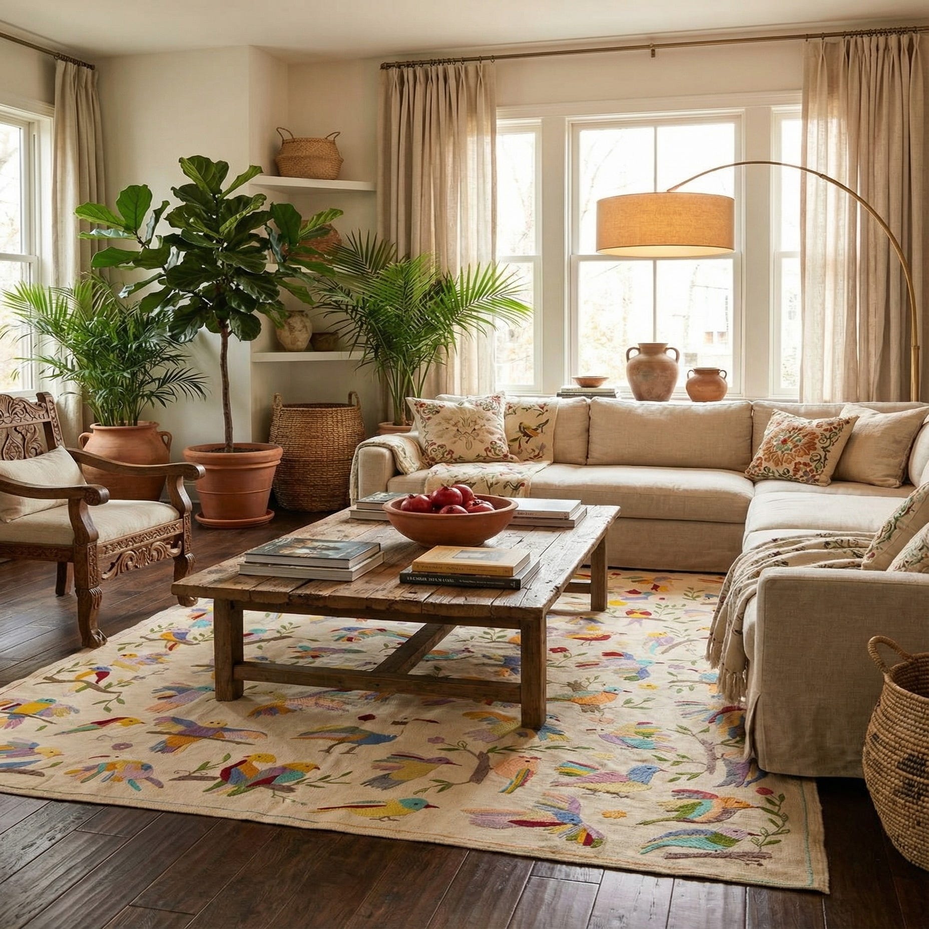 Primary color is Cream. Colors in this rug include: Cream, Blue, Light Green, Olive, Red, Yellow, Violet, Teal, Gray.