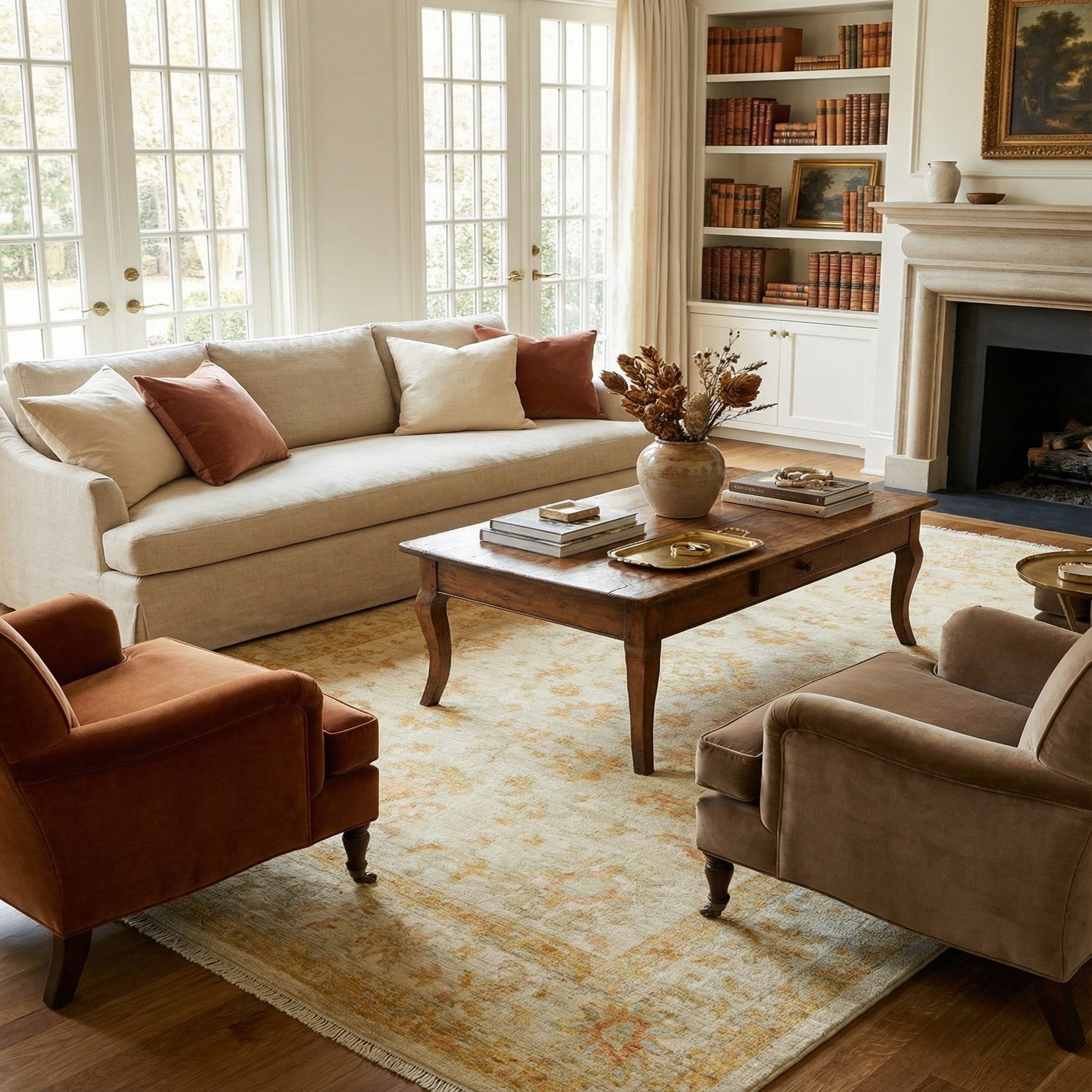 Primary color is Cream. Colors in this rug include: Cream, Cream, Beige, Blue, Red, Olive, Peach.