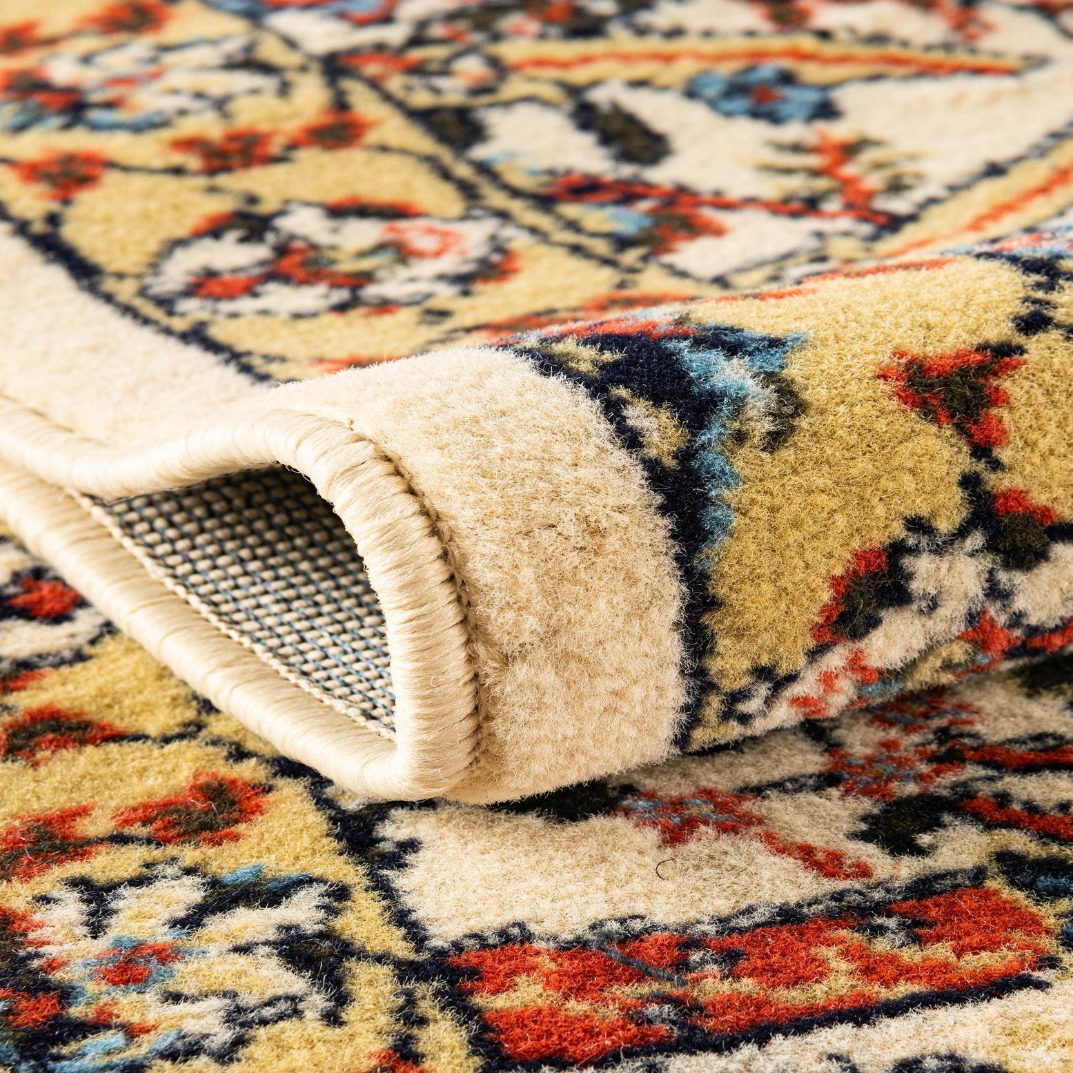 Primary color is Cream. Colors in this rug include: Cream, Black, Blue, Light Green, Red, Tan, Navy Blue.