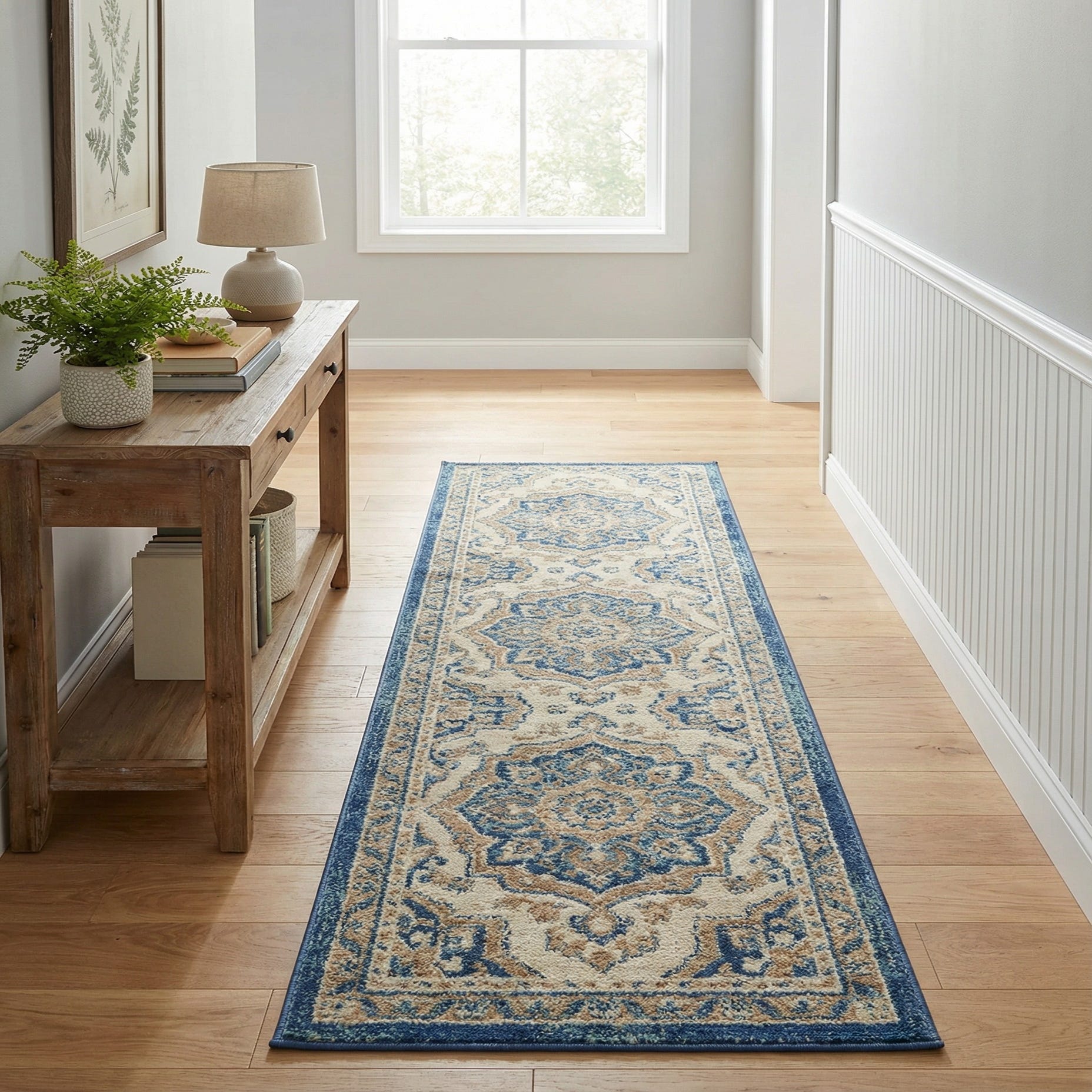 Primary color is Cream. Colors in this rug include: Cream, Blue, Beige, Ivory.