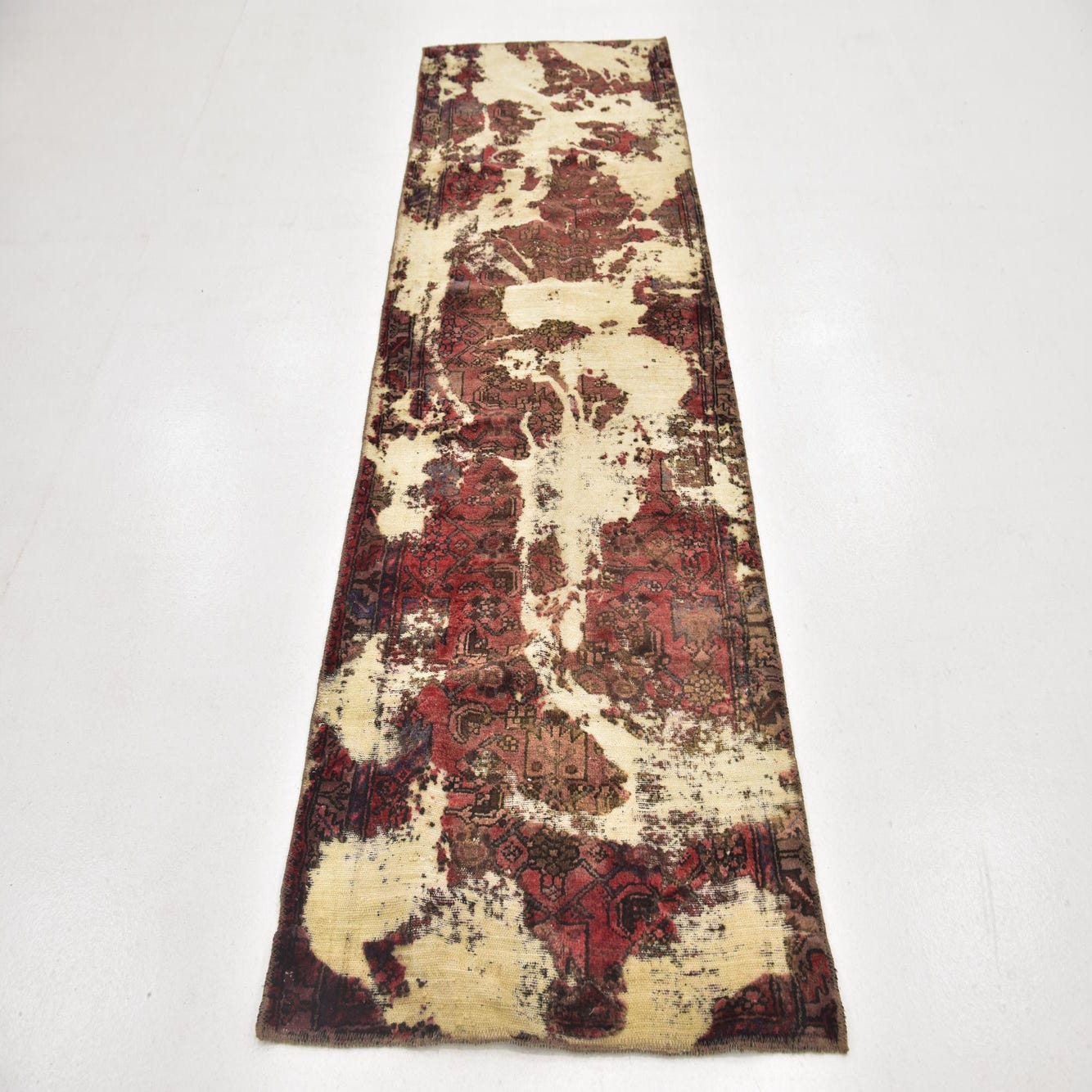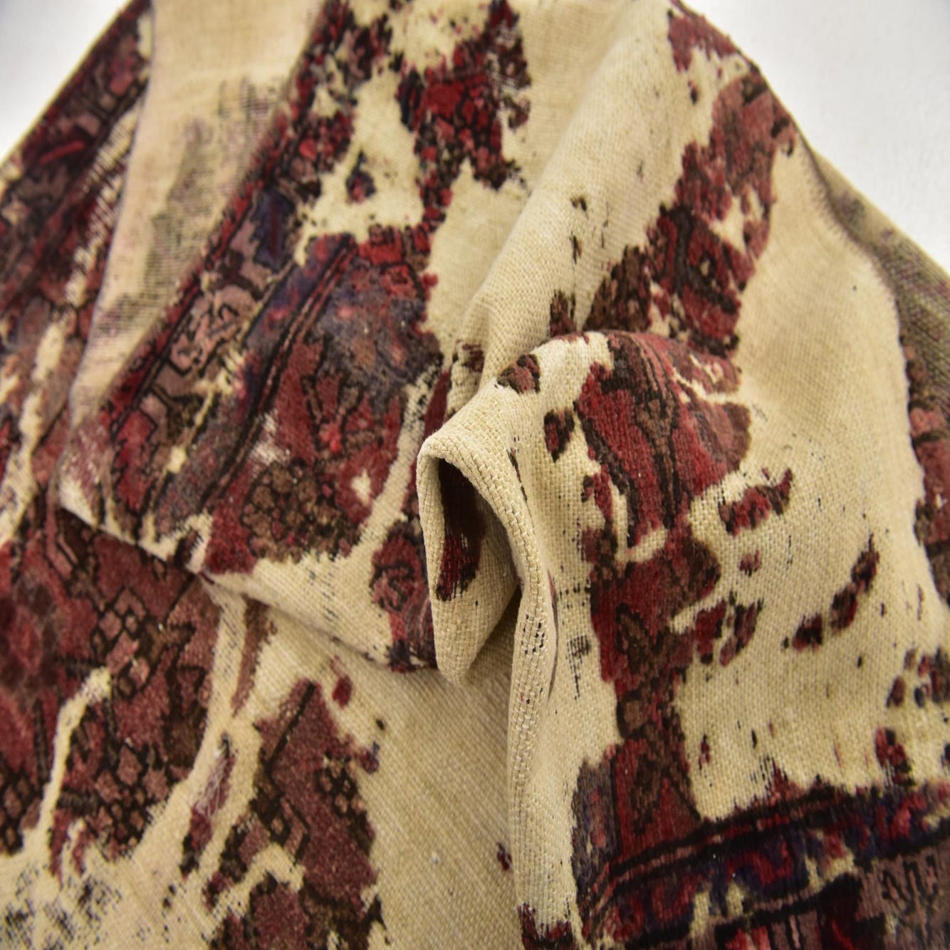 This Persian Ultra Vintage rug is an antique Persian Rug that has been washed, over-dyed, and then shaved down to a low pile. Look at the detail pictures to fully appreciate the uniqueness of this piece.