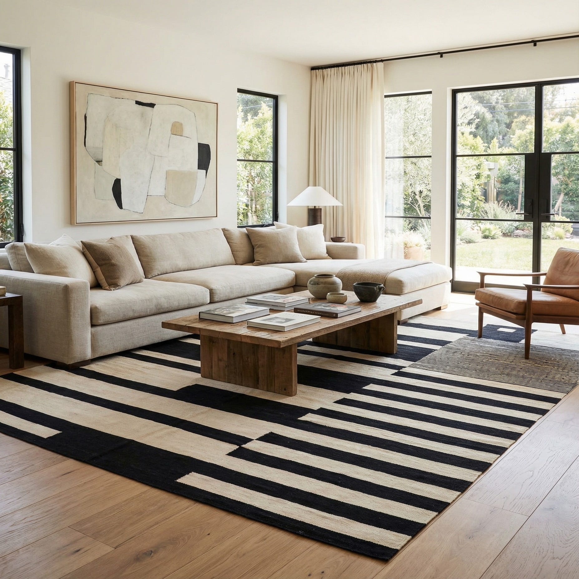 Primary color is Cream. Colors in this rug include: Cream, Black.