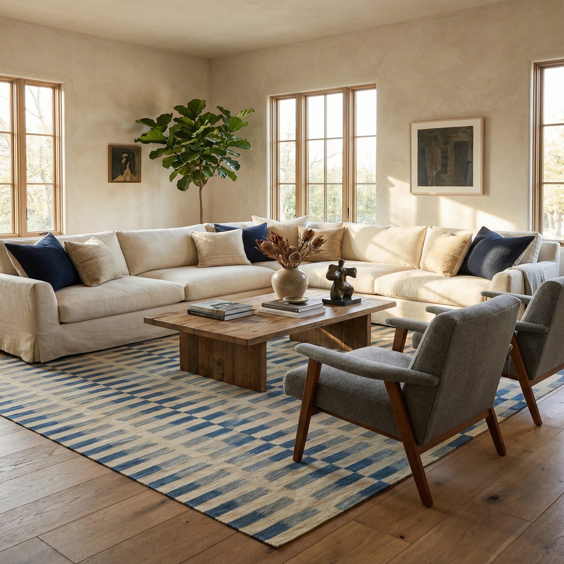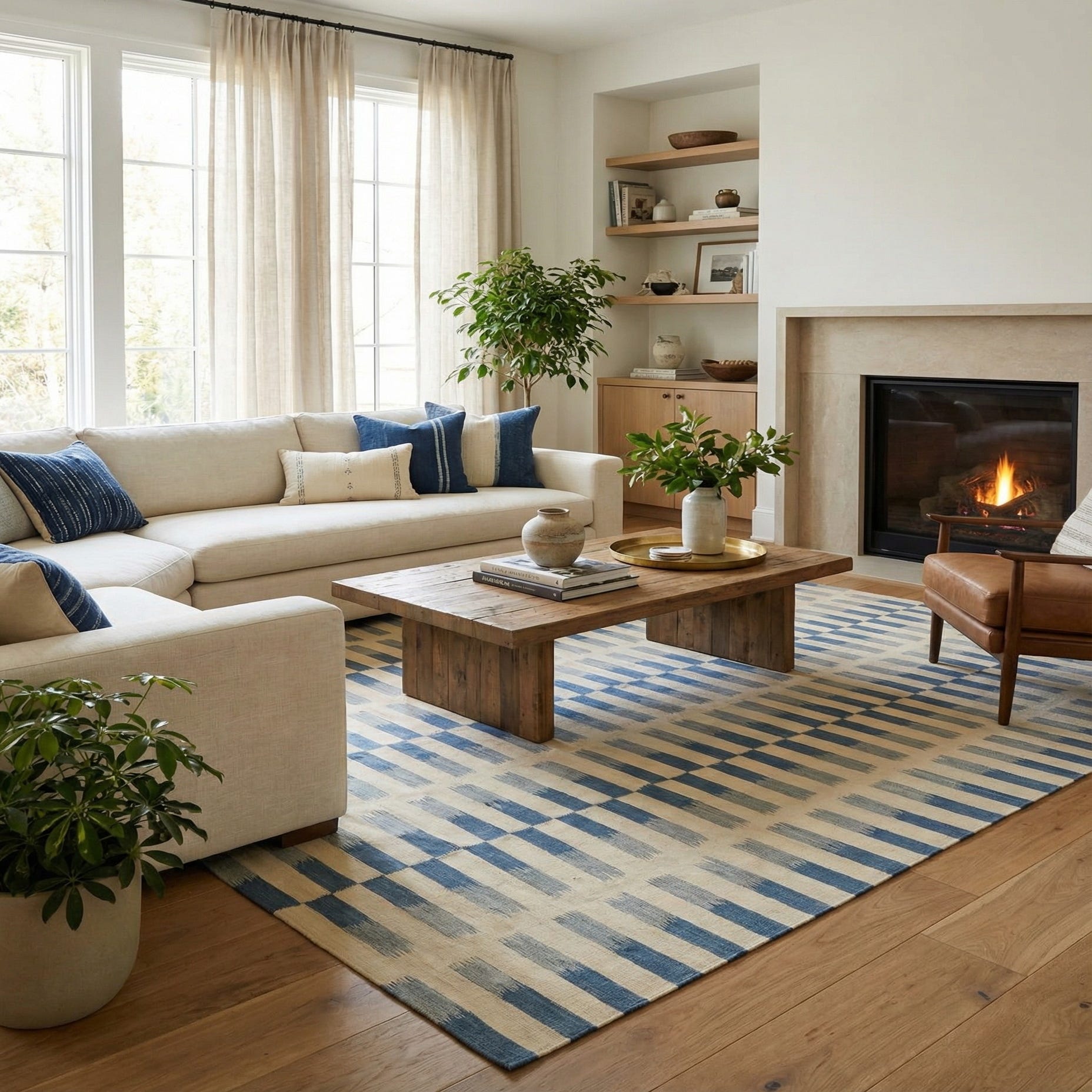 Primary color is Cream. Colors in this rug include: Cream, Blue.