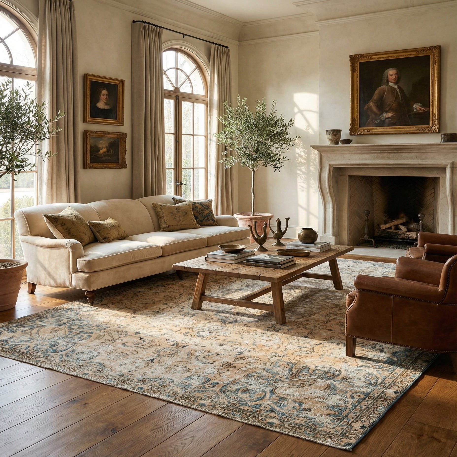 Primary color is Cream. Colors in this rug include: Cream, Cream, Light Blue, Peach, Light Brown, Brown.