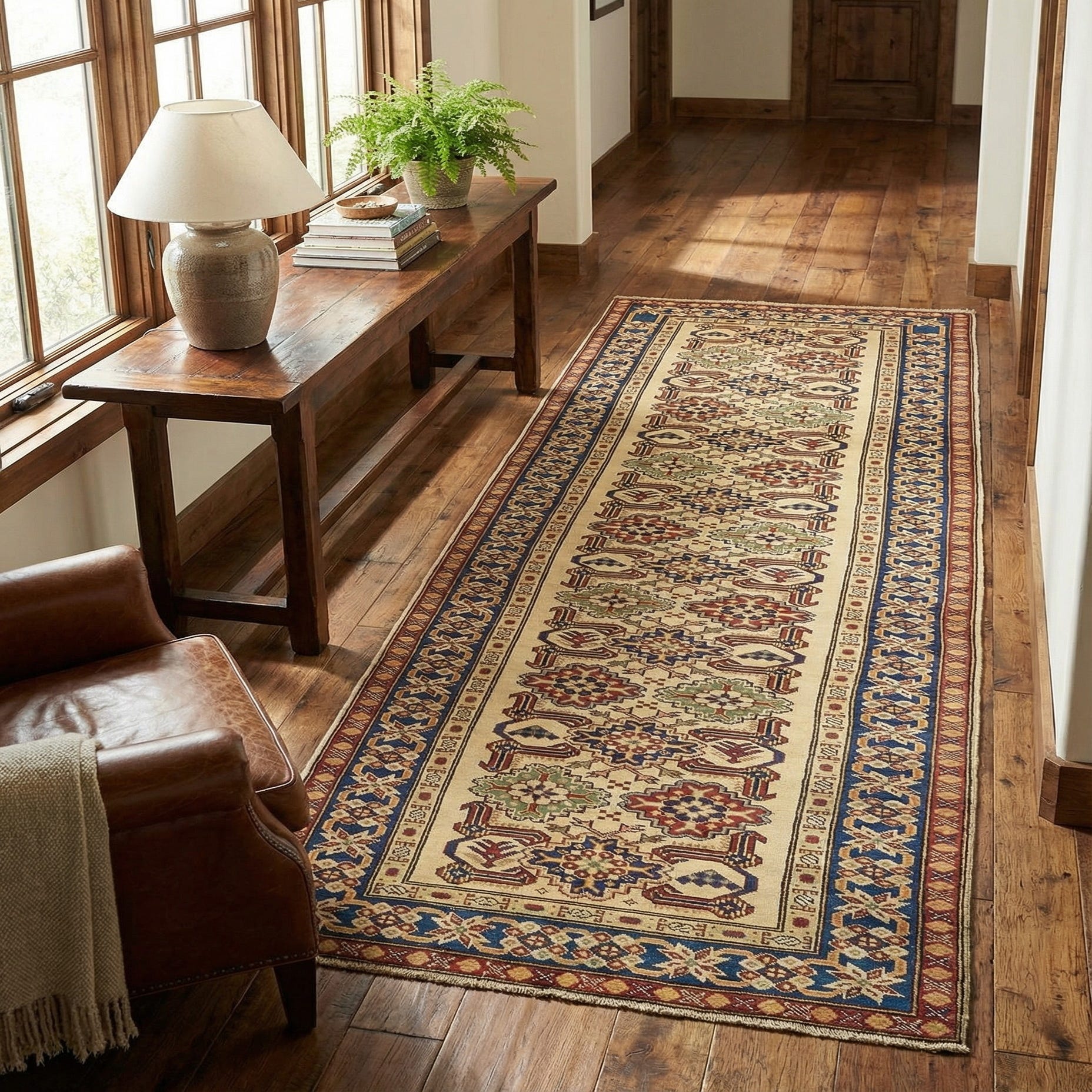 Primary color is Cream. Colors in this rug include: Cream, Blue, Brown, Green, Navy Blue, Salmon, Tan.