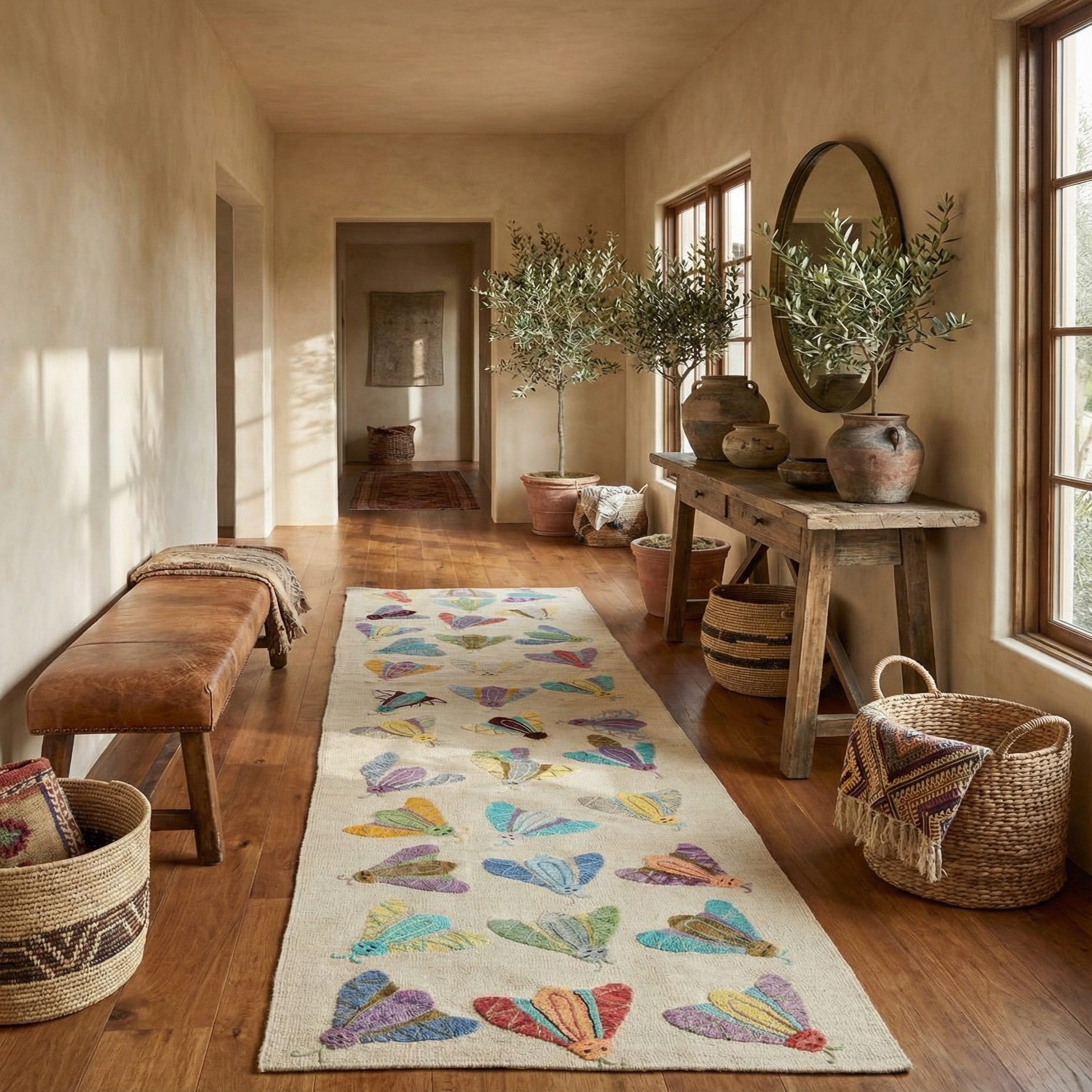Primary color is Cream. Colors in this rug include: Cream, Olive, Orange, Yellow, Violet, Gray, Green, Red.