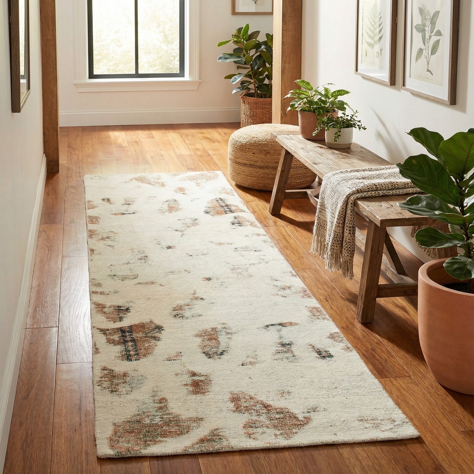Primary color is Cream. Colors in this rug include: Cream, Beige, Brown, Puce, Navy Blue.