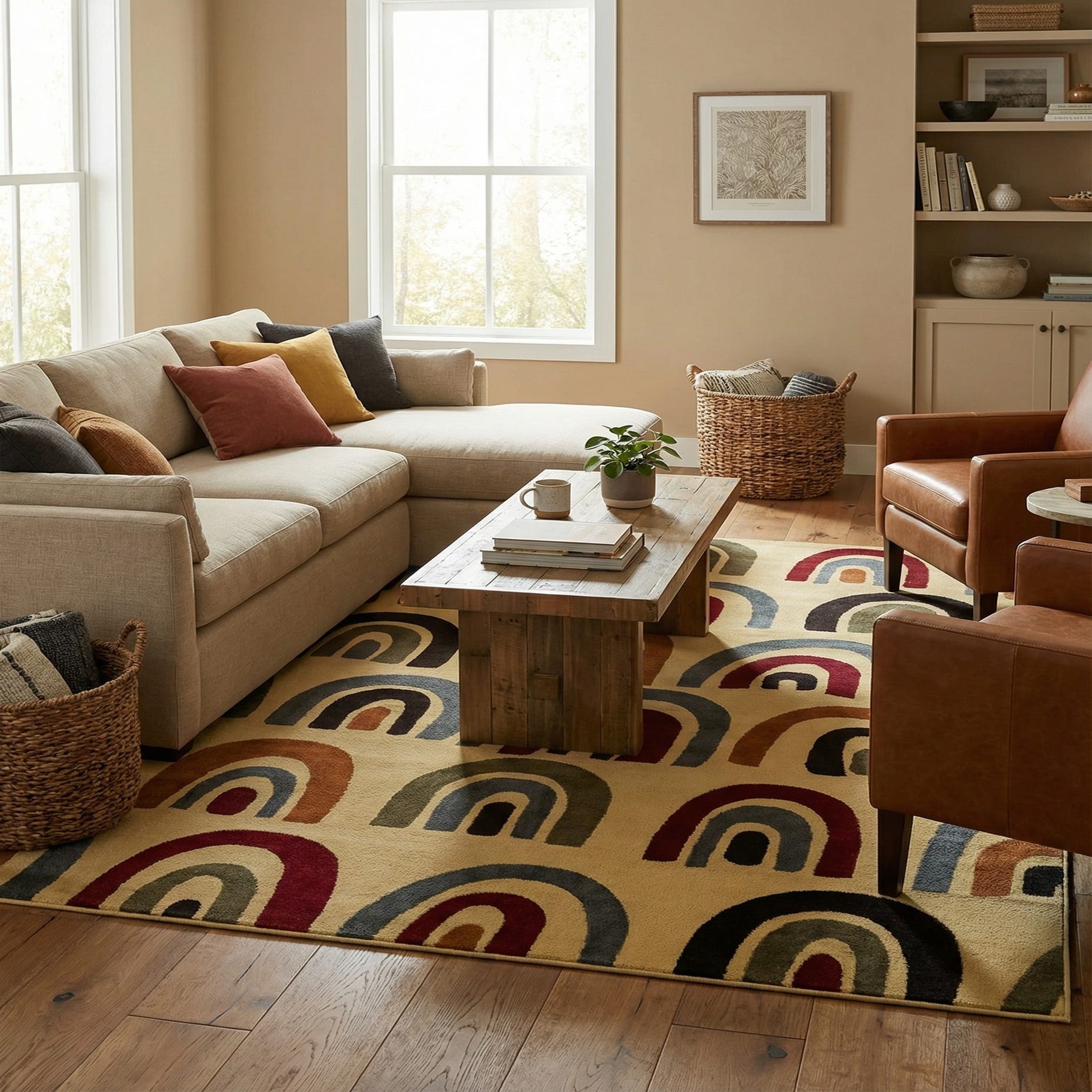 Primary color is Cream. Colors in this rug include: Cream, Brown, Burgundy, Gray, Olive, Maroon.