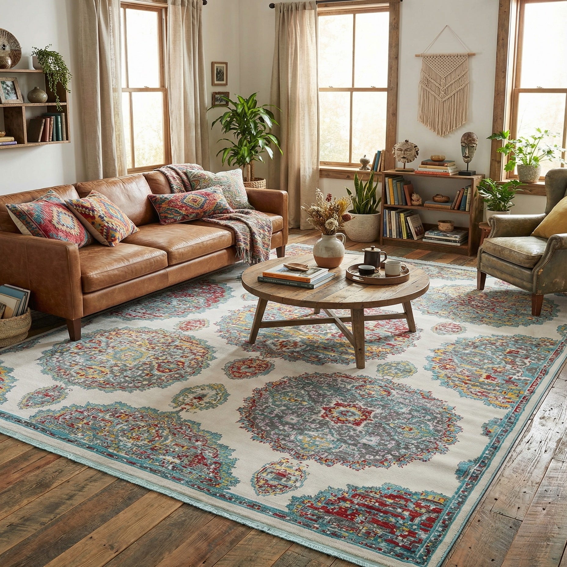 Primary color is Cream. Colors in this rug include: Cream, Blue, Gray, Green, Red, Yellow, Pink.