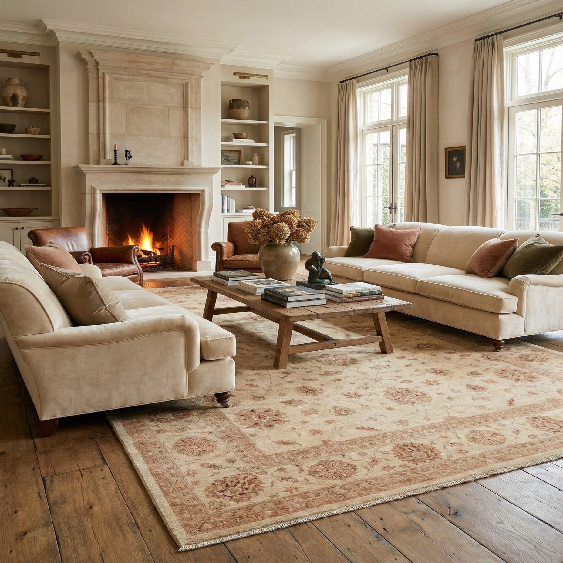 Primary color is Cream. Colors in this rug include: Cream, Beige, Brown, Light Green, Olive, Peach, Red, Tan.