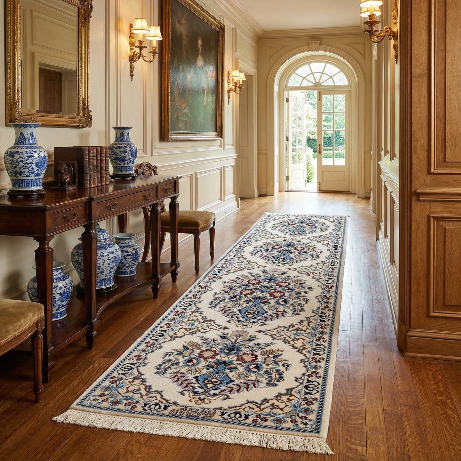 Primary color is Cream. Colors in this rug include: Cream, Runner.