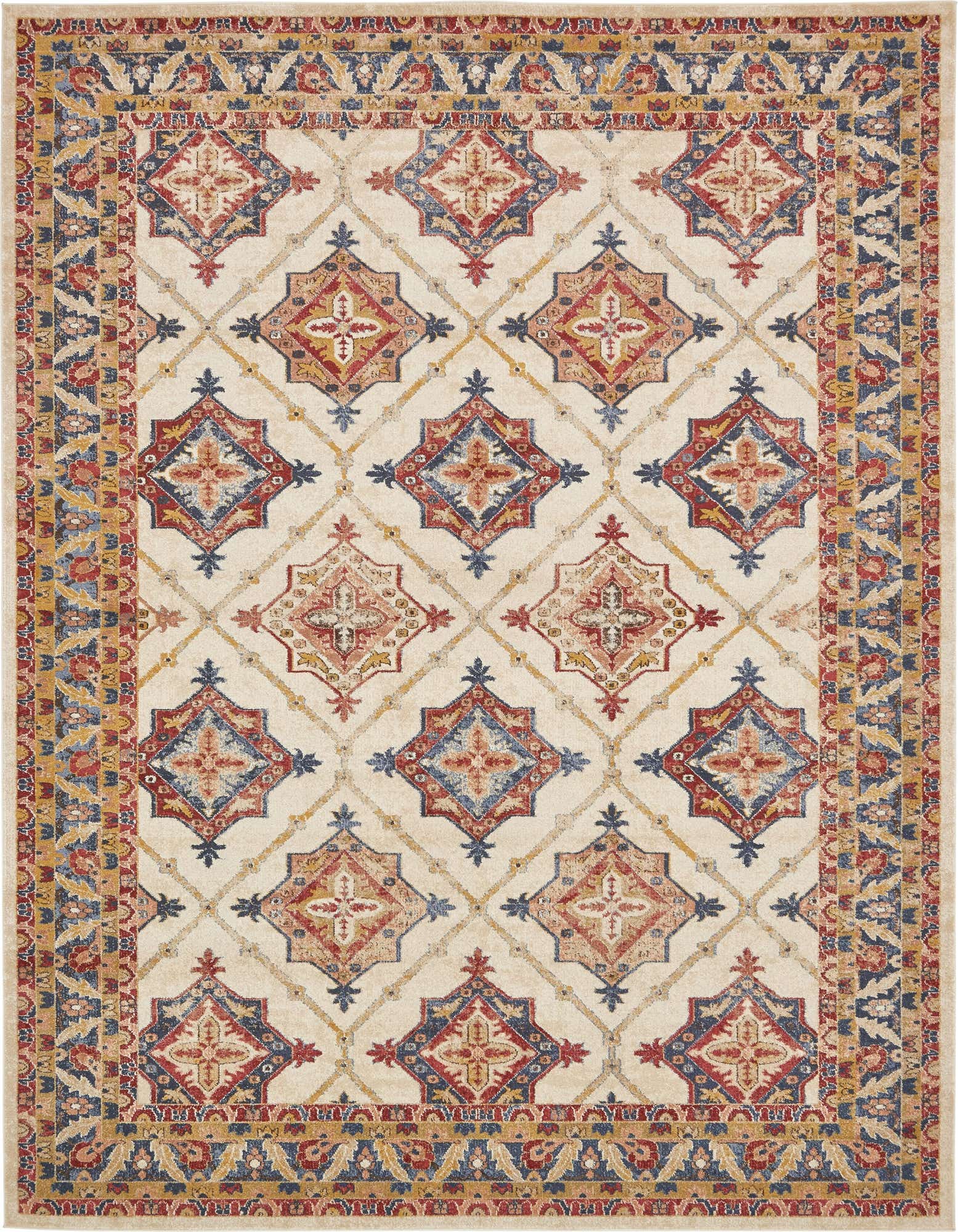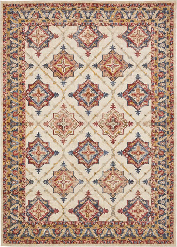 Primary color is Cream. Colors in this rug include: Cream, Brown, Burgundy, Gold, Light Blue, Navy Blue, Peach, Terracotta.