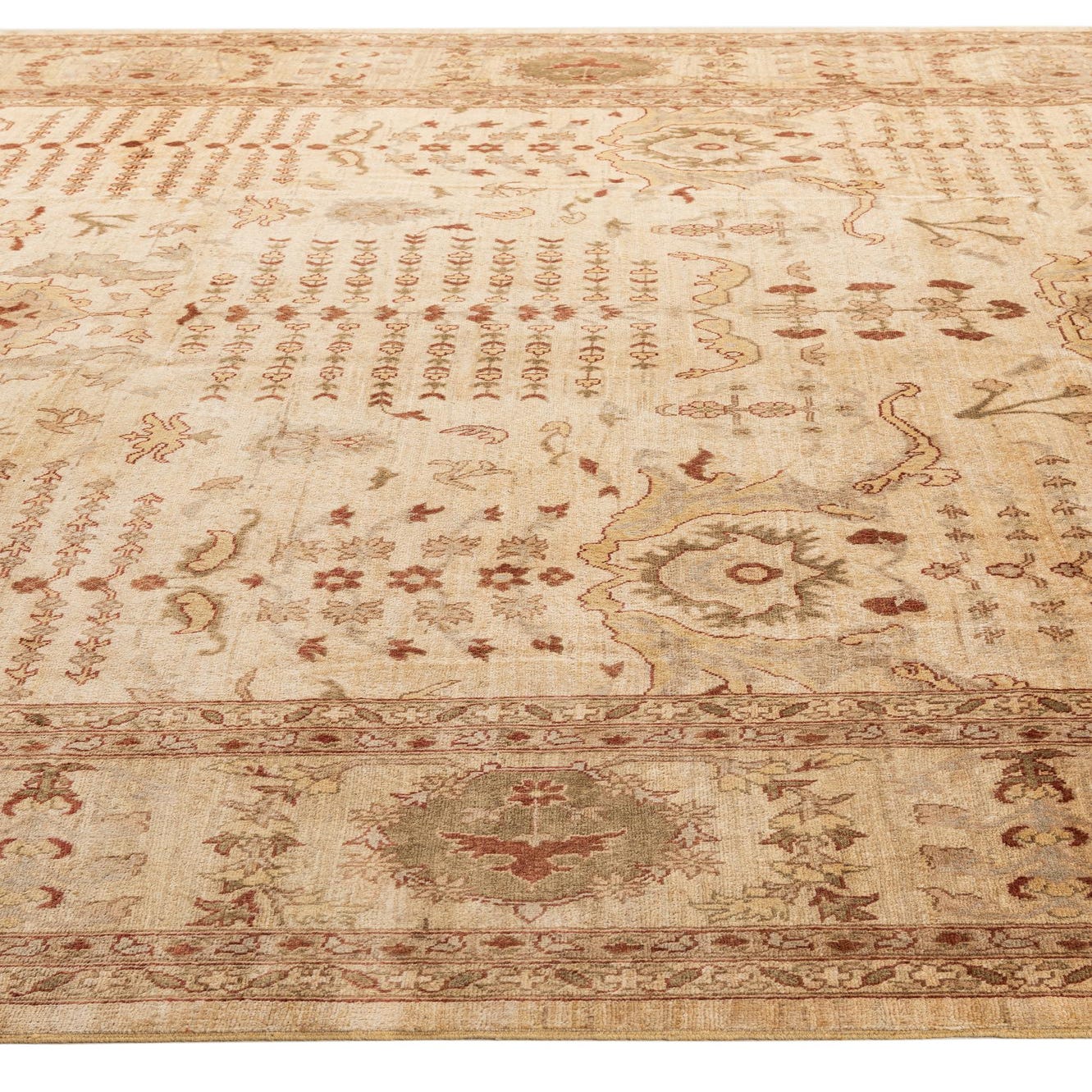 Primary color is Cream. Colors in this rug include: Cream, Brown, Gray, Olive.