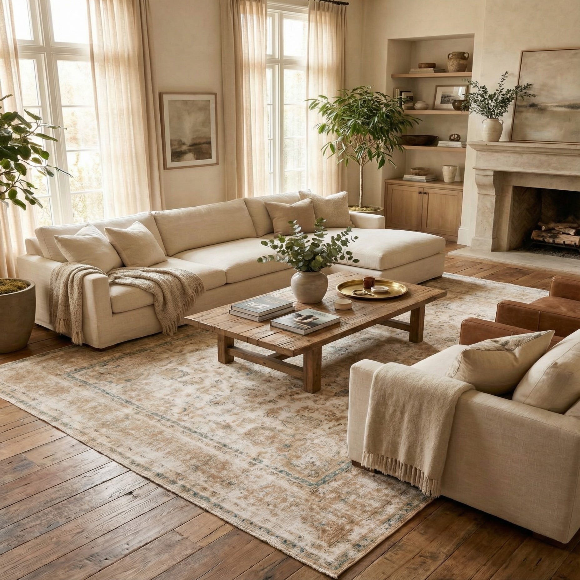 Primary color is Dark Beige. Colors in this rug include: Dark Beige, Brown, Navy Blue.