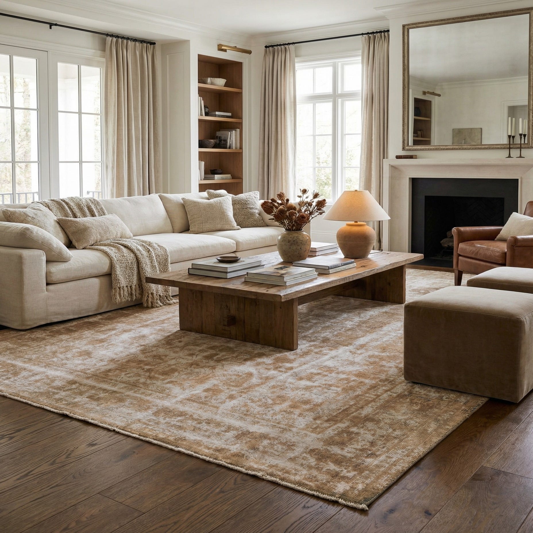 Primary color is Dark Beige. Colors in this rug include: Dark Beige, Ivory.