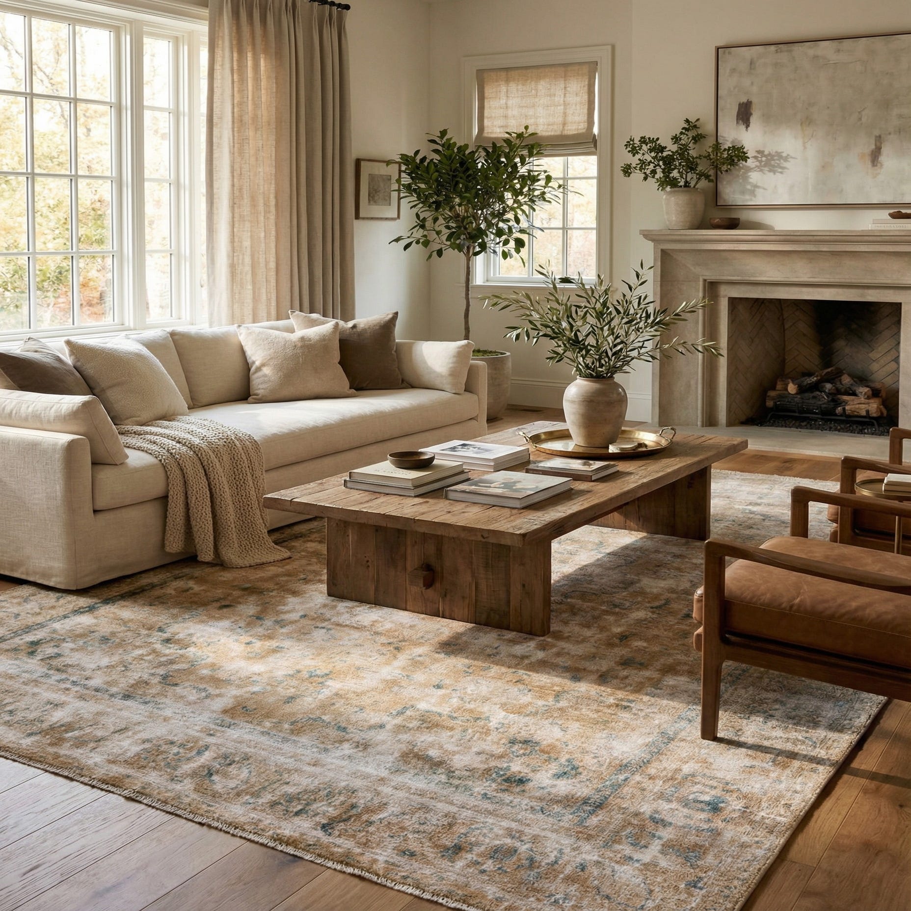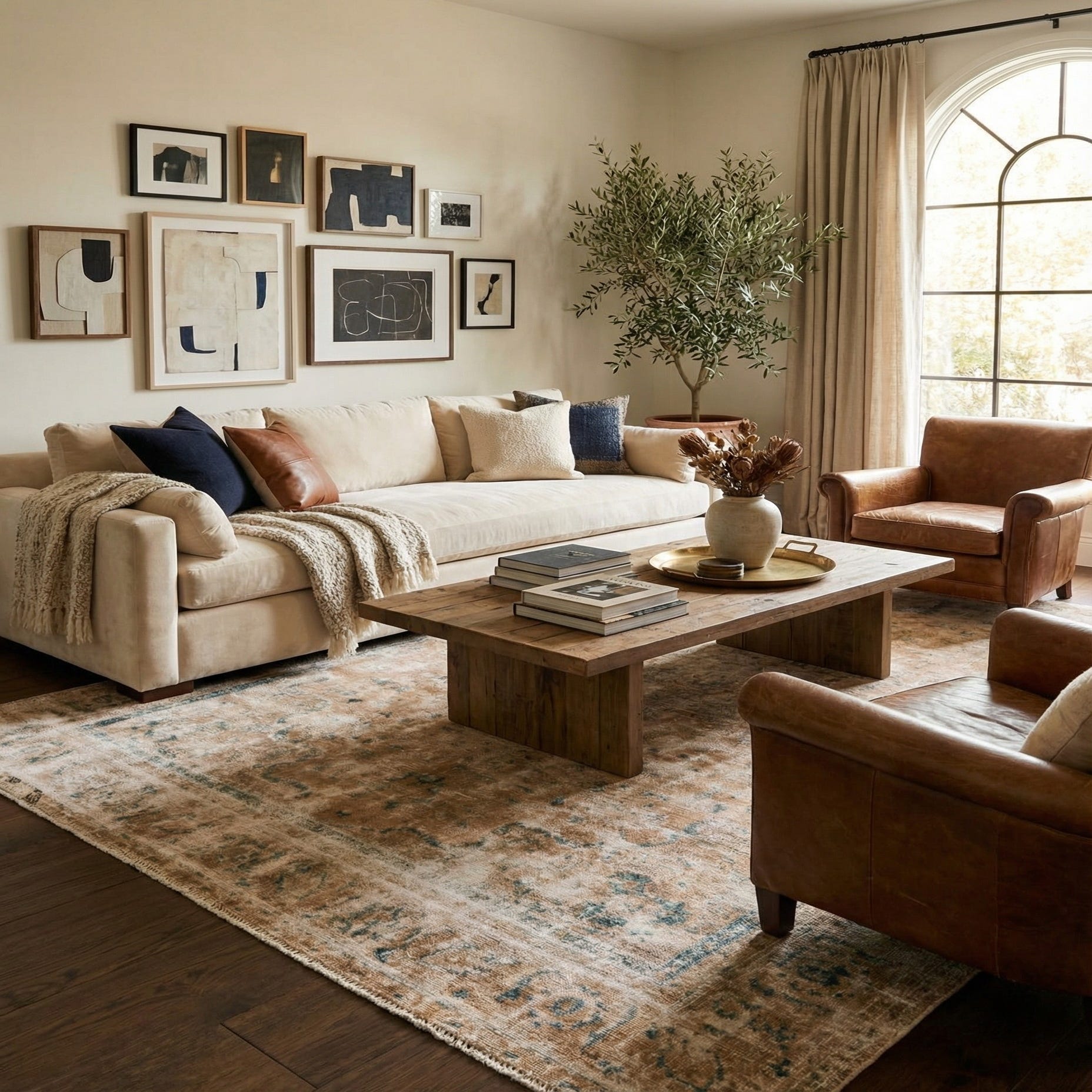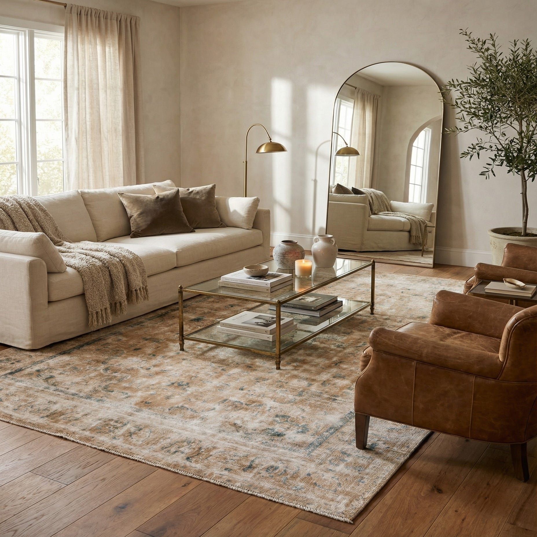 Primary color is Dark Beige. Colors in this rug include: Dark Beige, Brown, Ivory, Navy Blue.