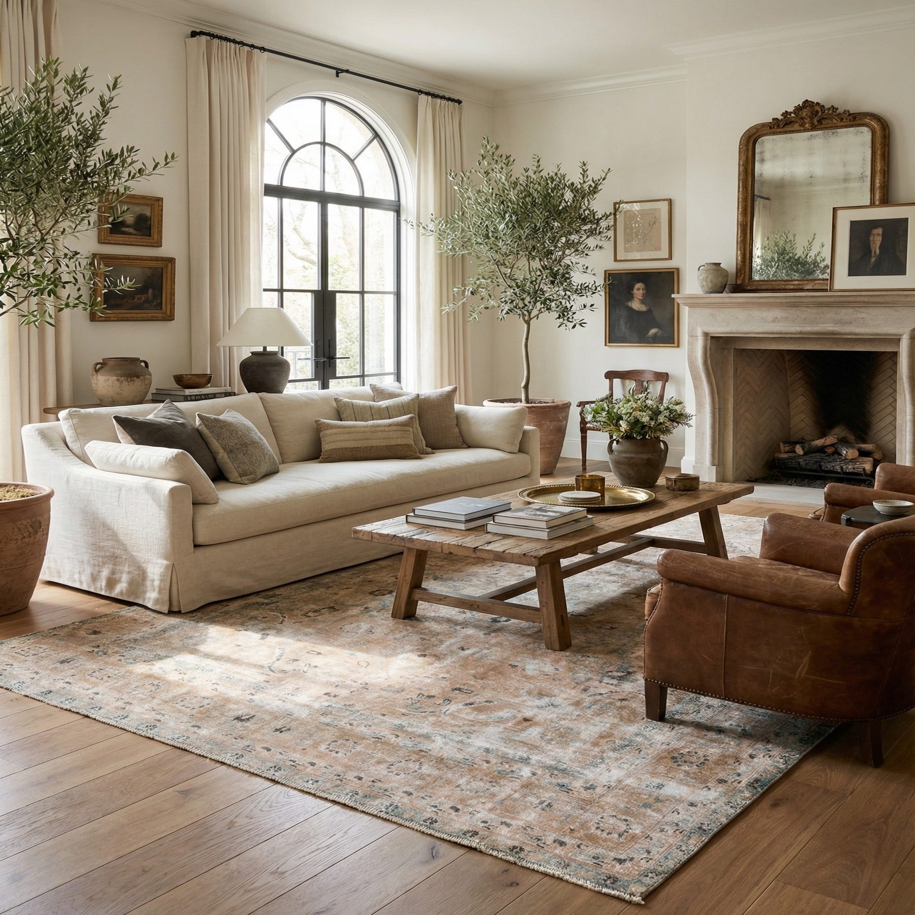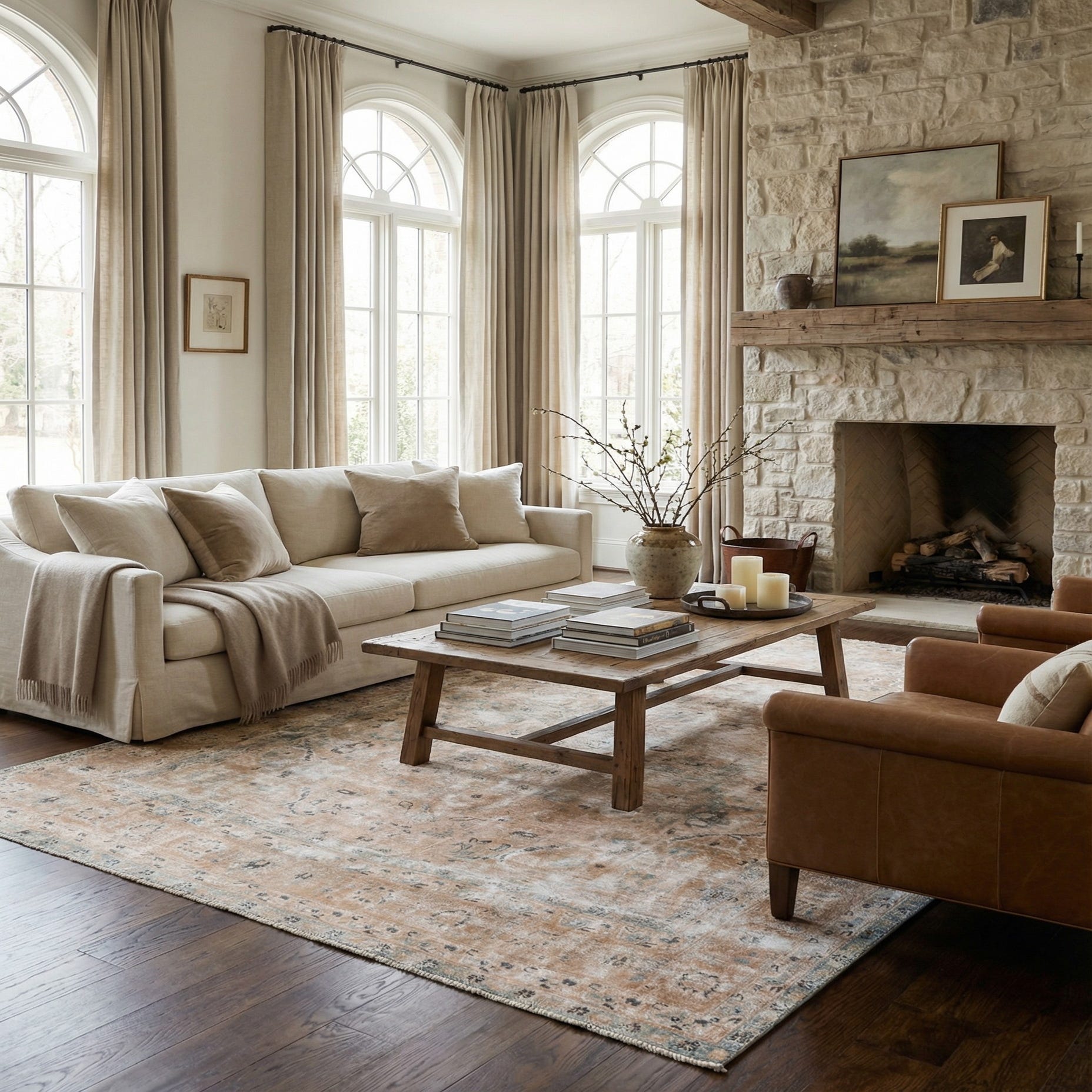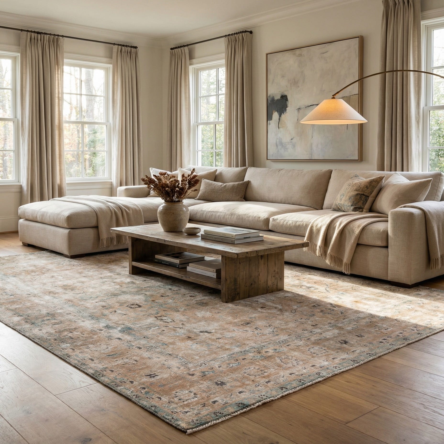 Primary color is Dark Beige. Colors in this rug include: Dark Beige, Brown, Ivory, Navy Blue.