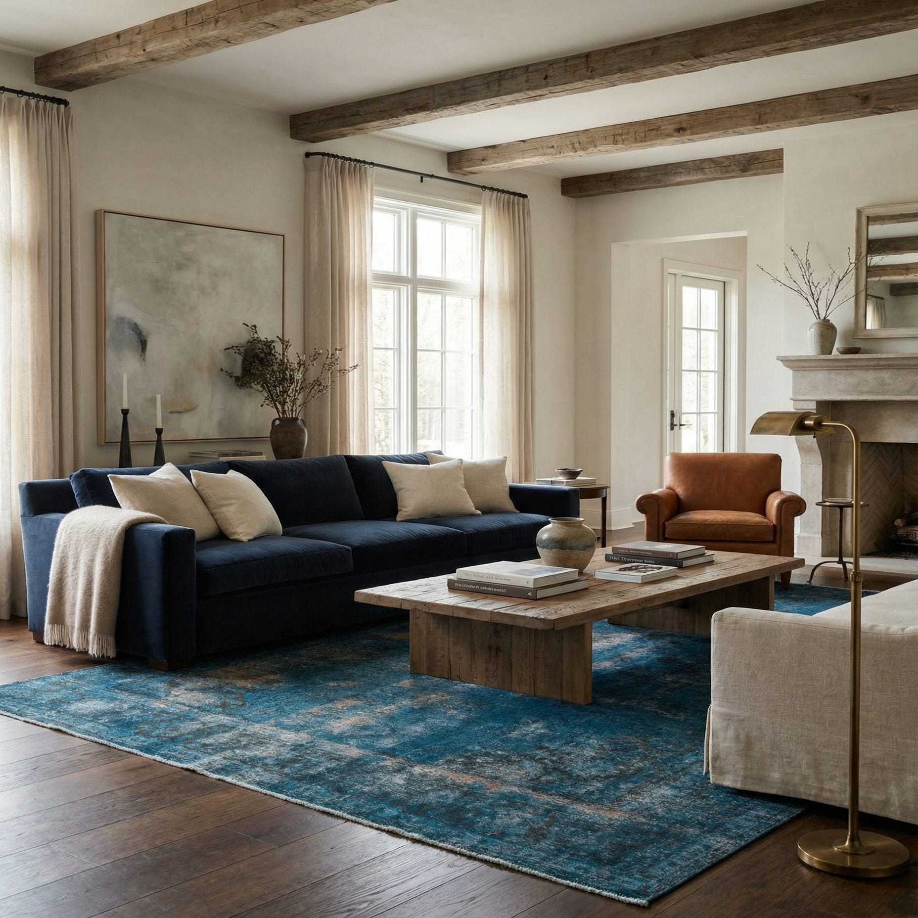 Primary color is Dark Blue. Colors in this rug include: Dark Blue, Beige, Black.