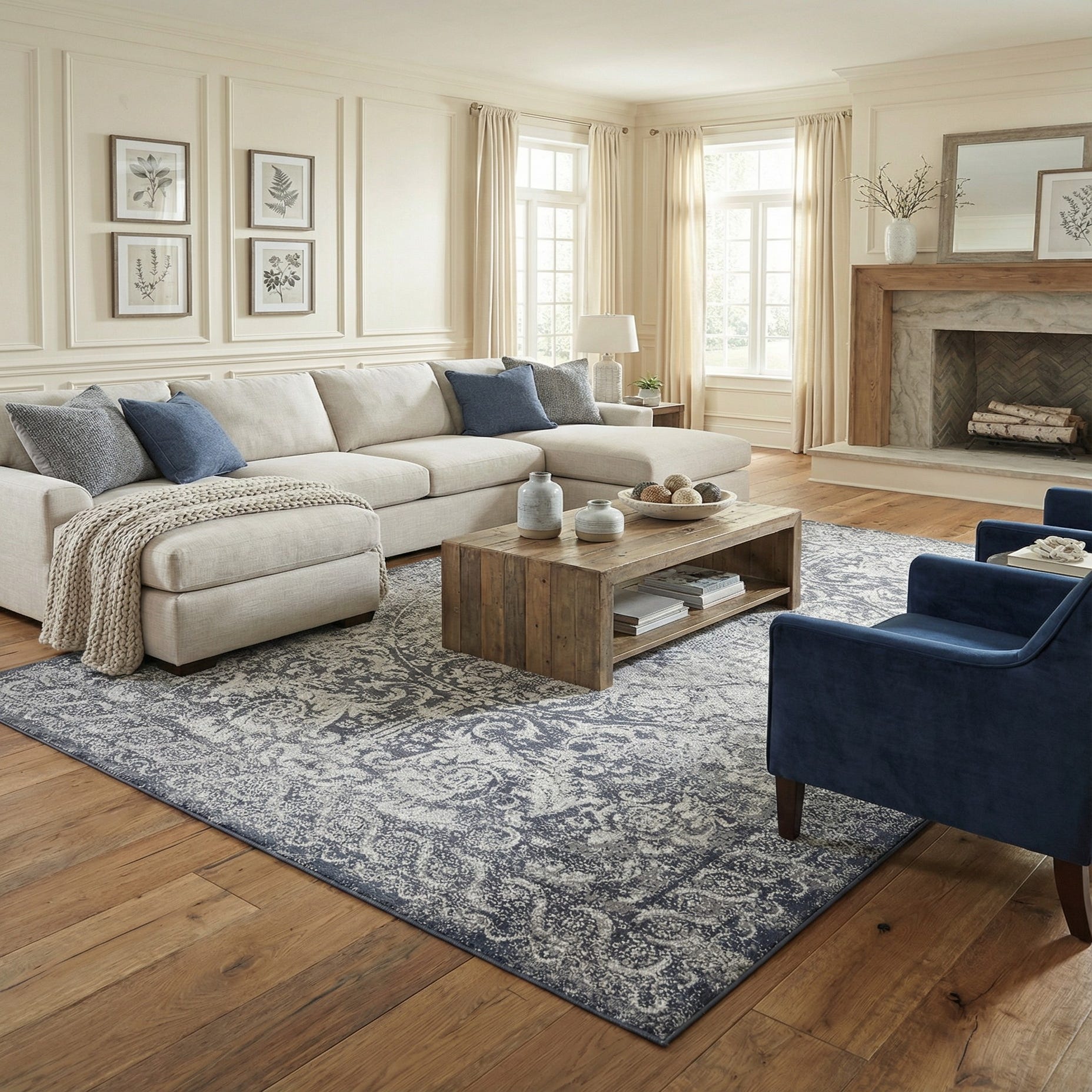 Primary color is Dark Blue. Colors in this rug include: Dark Blue, Gray, Ivory.